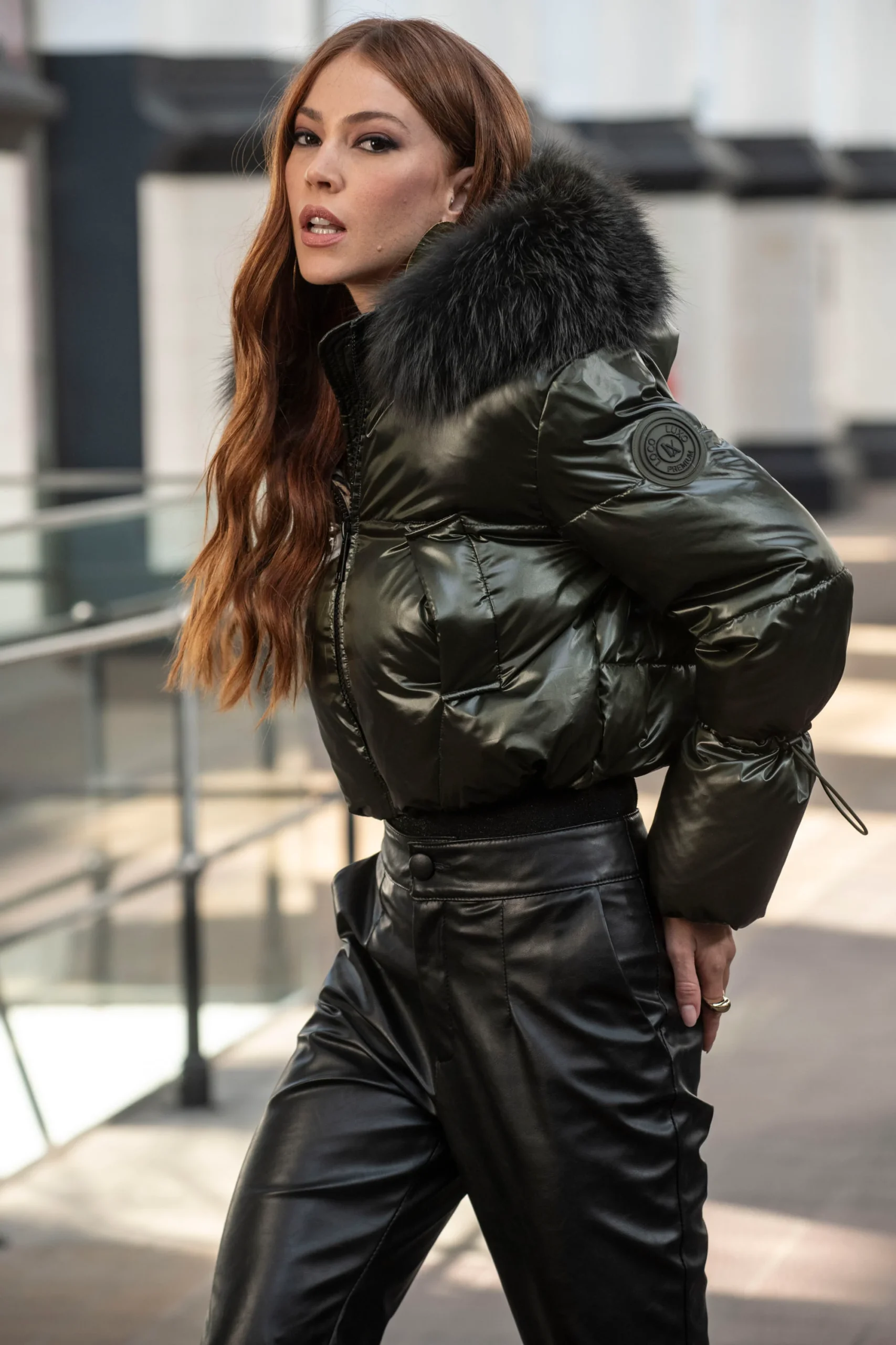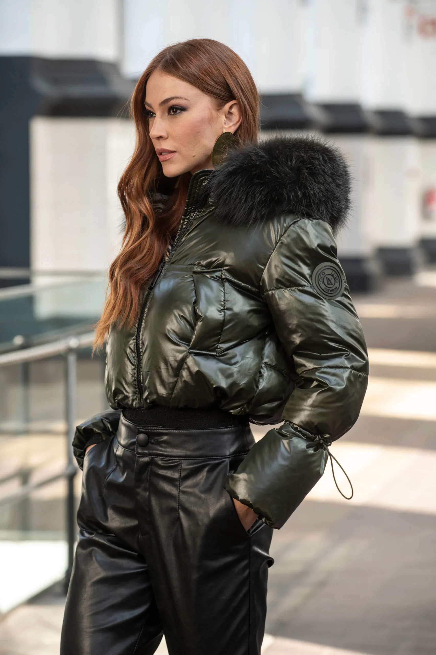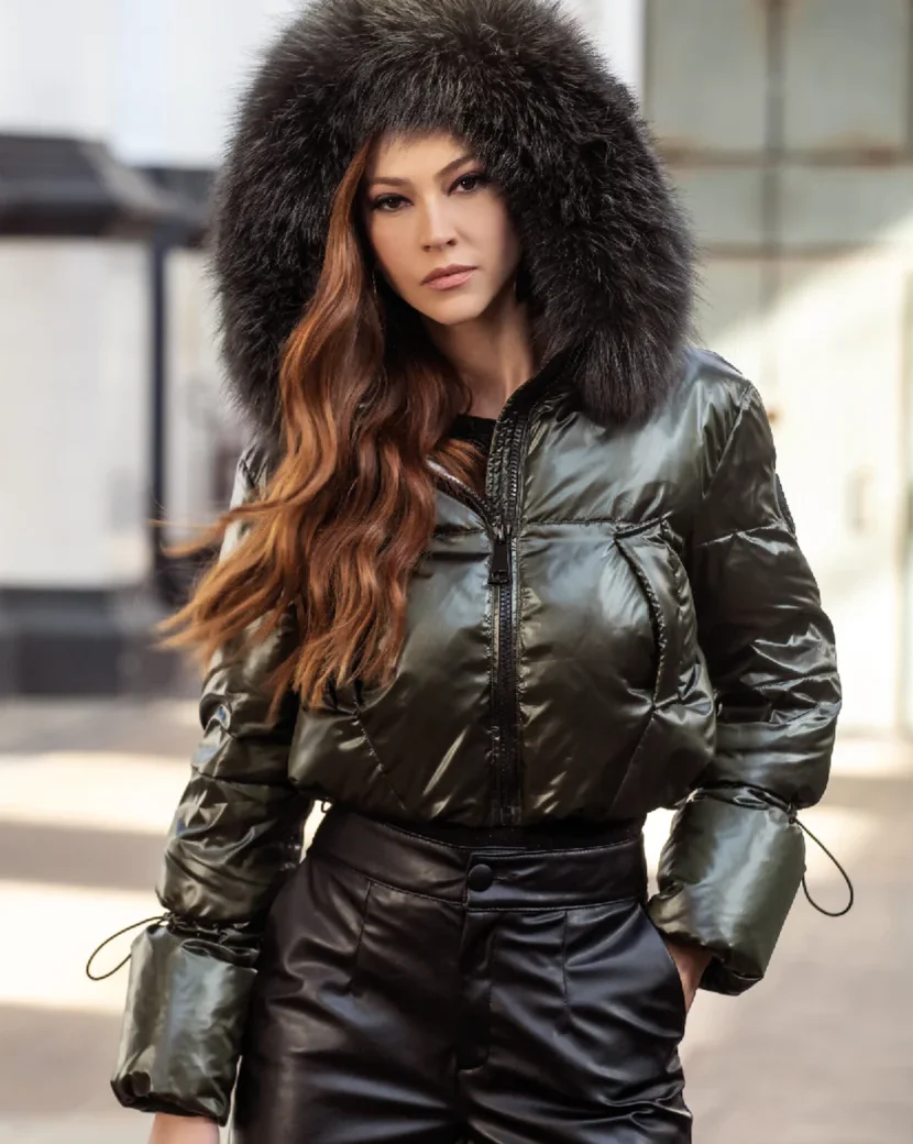 Su lujoso pelo de zorro en la capucha verde junto con el relleno de plumas de pato y plumón, crean un equilibrio perfecto entre elegancia y comodidad térmica.