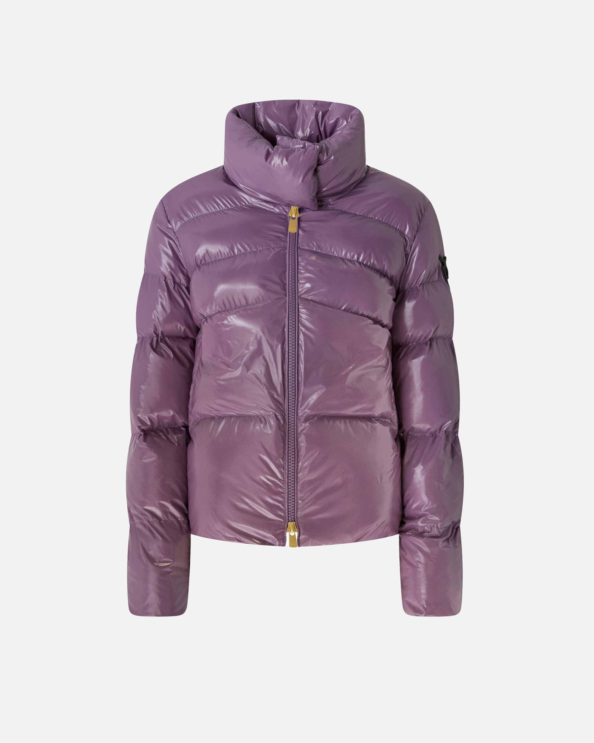 Abrigo acolchado de nailon con efecto cristal y un acabado brillante especial, personalizado con el parche del logo de Love Birds en una manga. Este modelo presenta un acolchado horizontal ligeramente inclinado en la parte delantera y un cuello alto envolvente con botones ocultos para protegerte del frío. Cierre frontal con cremallera metálica bidireccional.