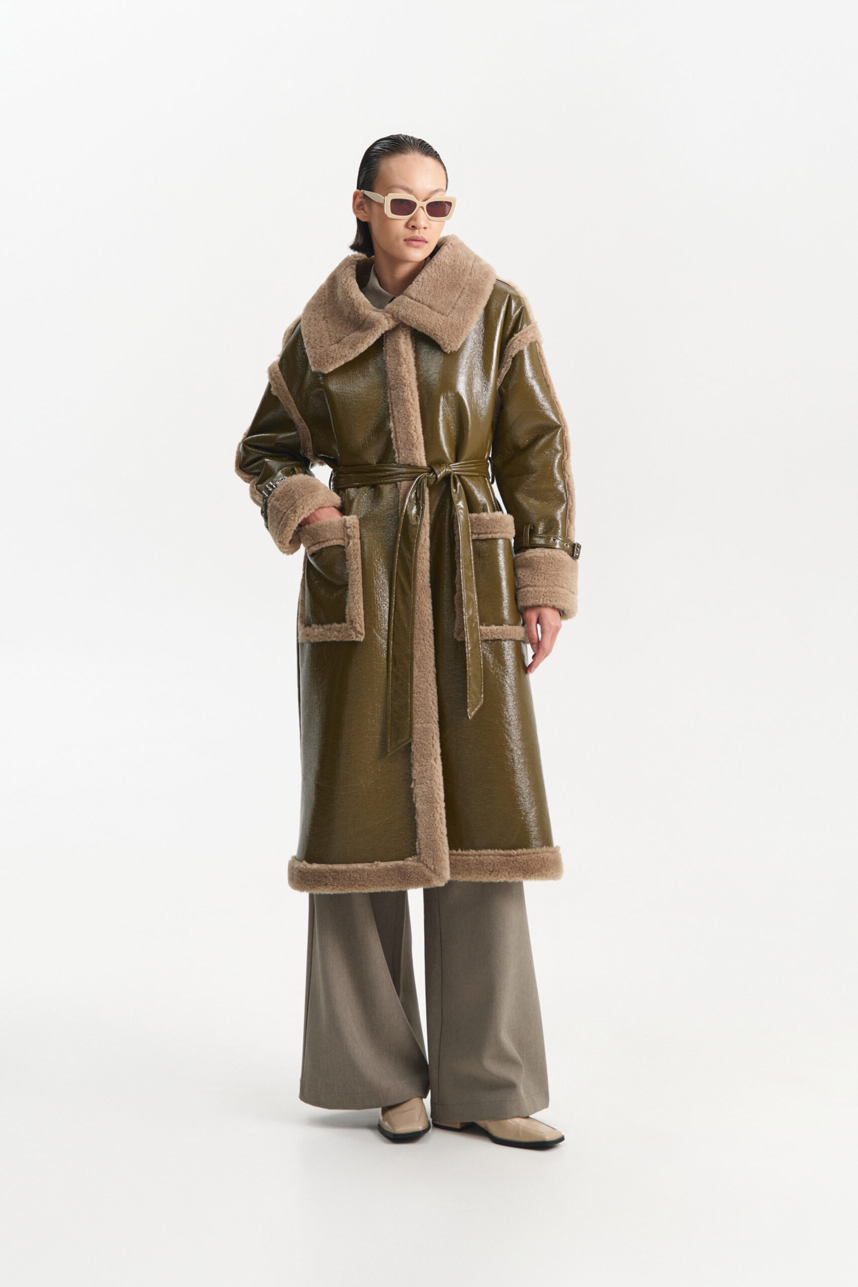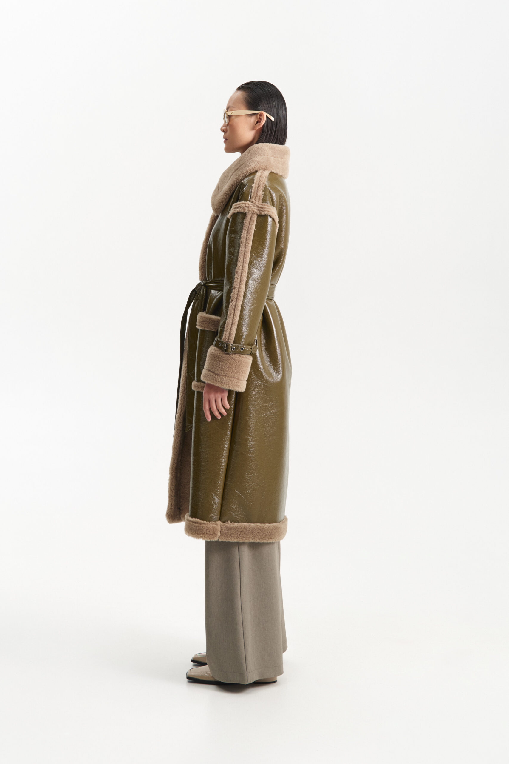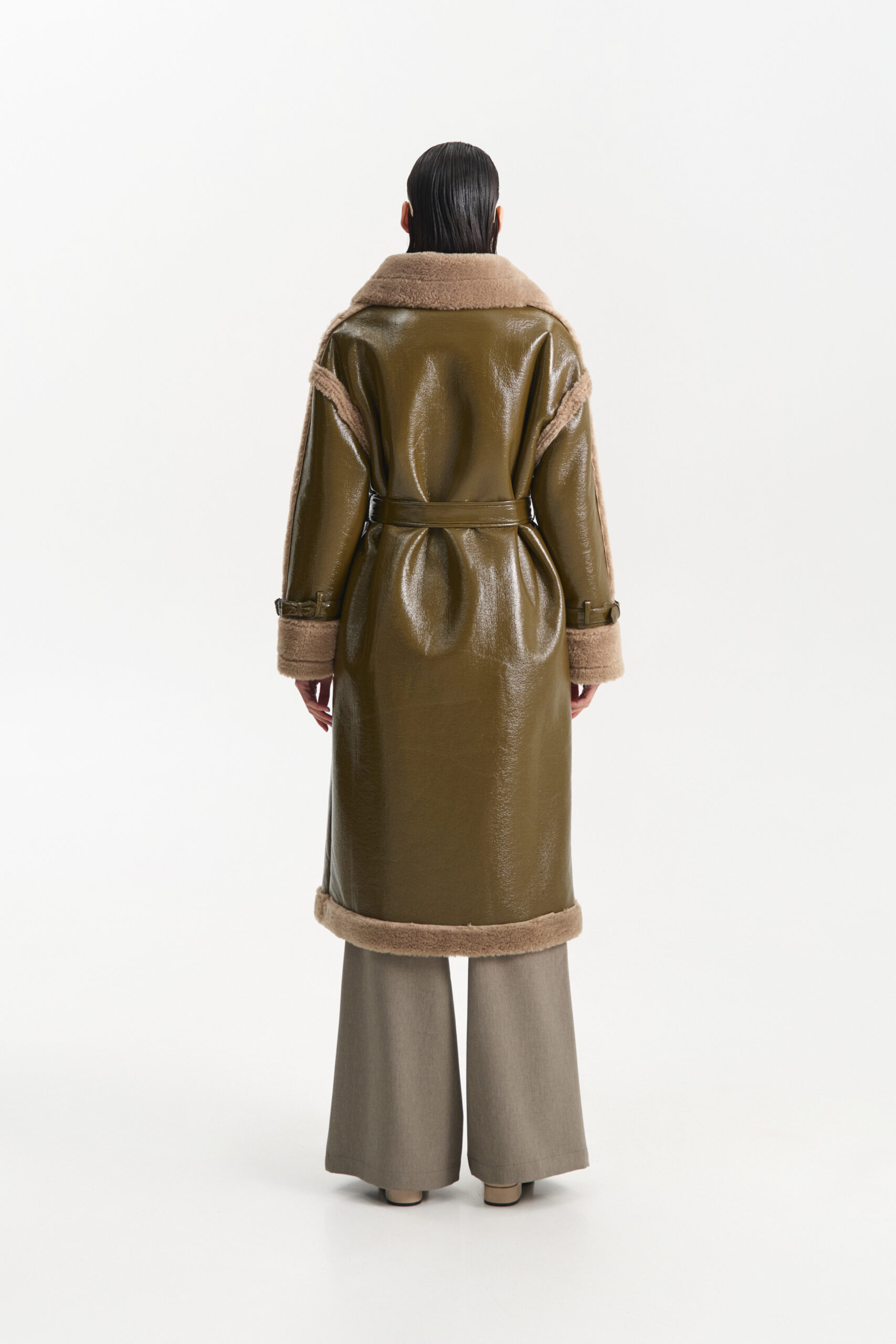 Este abrigo largo para mujer destaca por su diseño moderno y cálido. Fabricado en un tono verde oliva con acabado brillante, incorpora detalles de forro de shearling beige en el cuello, puños, bolsillos y borde inferior, aportando un toque acogedor y lujoso. Incluye un cinturón a juego para definir la cintura y mangas con ajuste en los puños. Perfecto para el invierno, combina estilo y funcionalidad con un aire sofisticado.