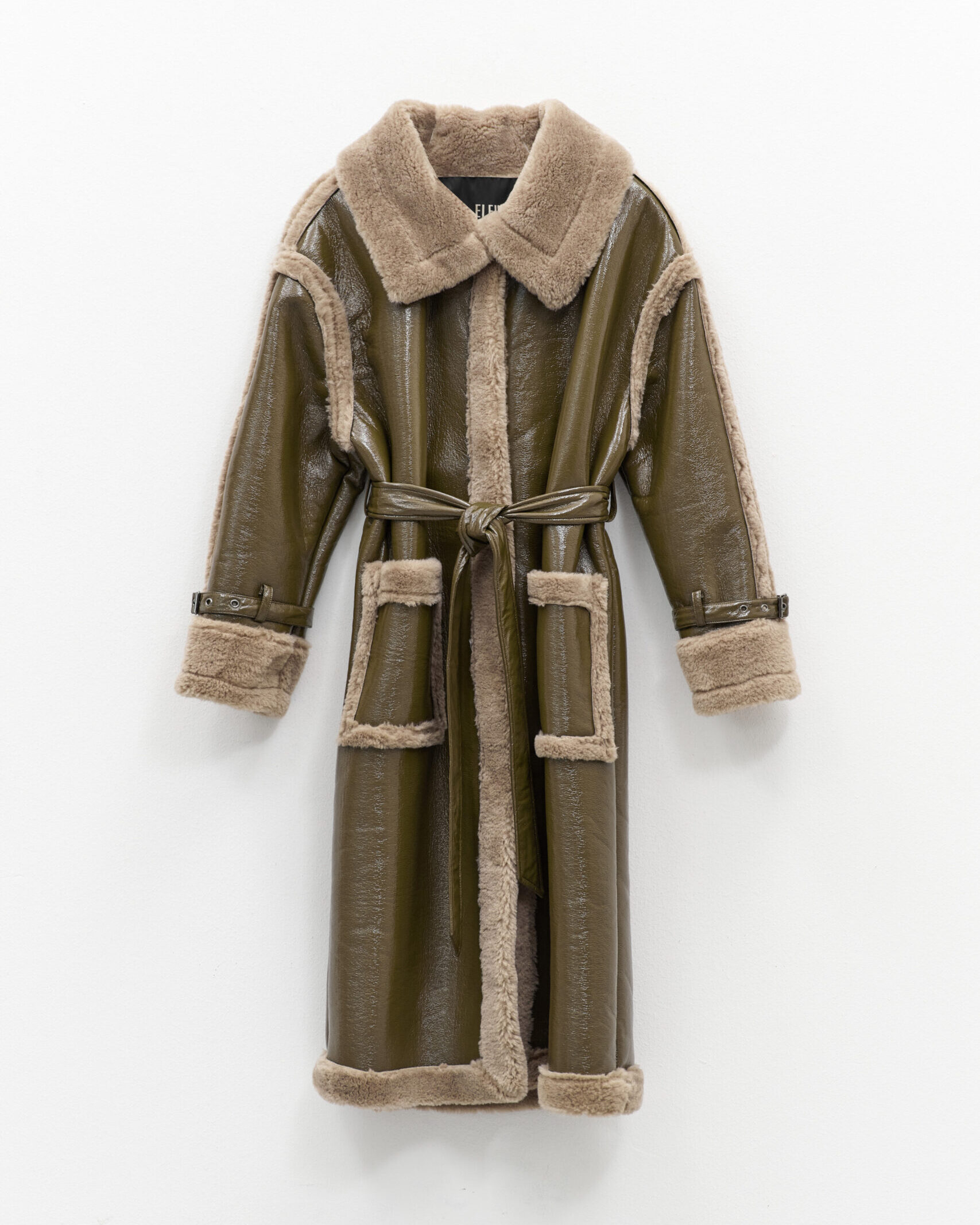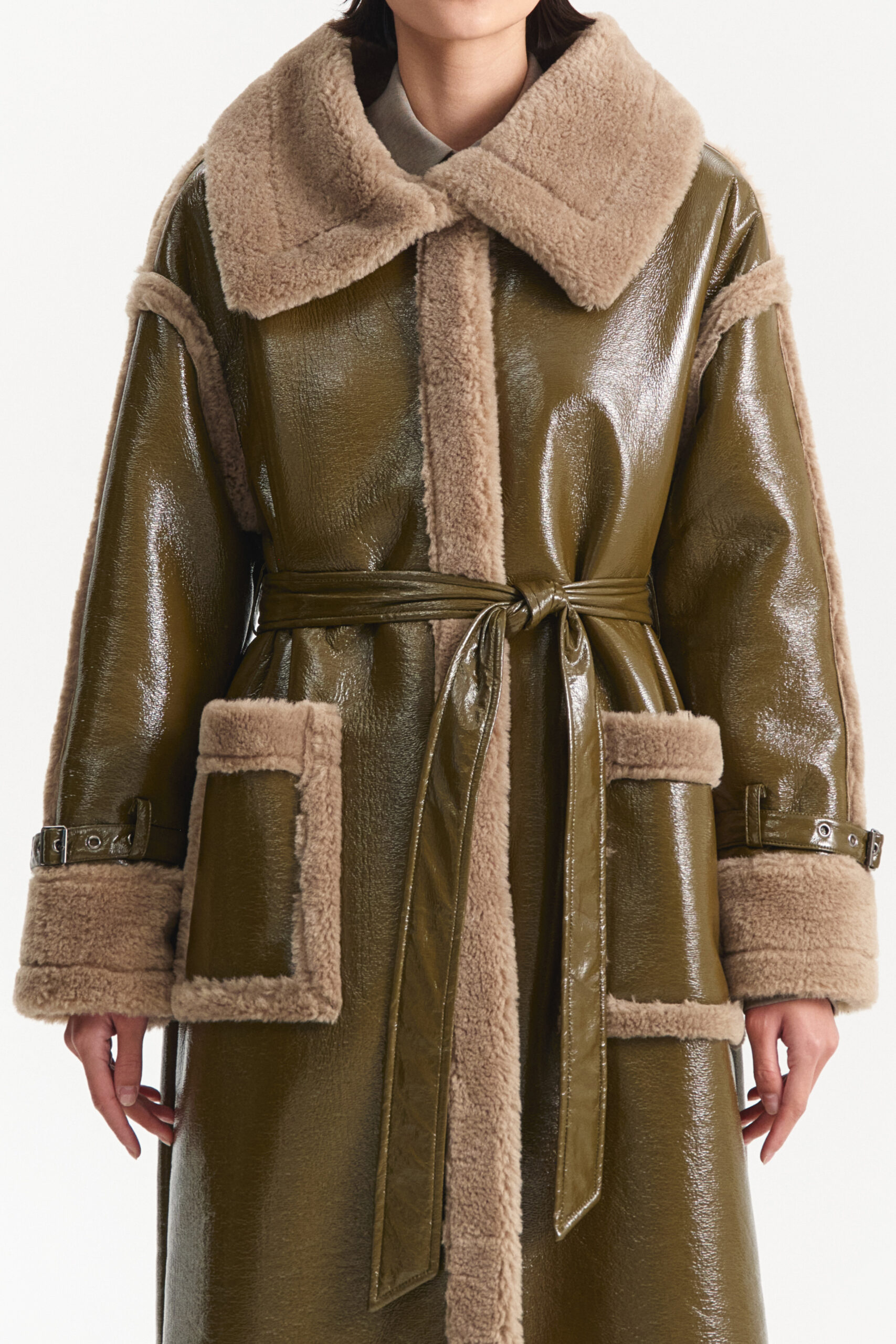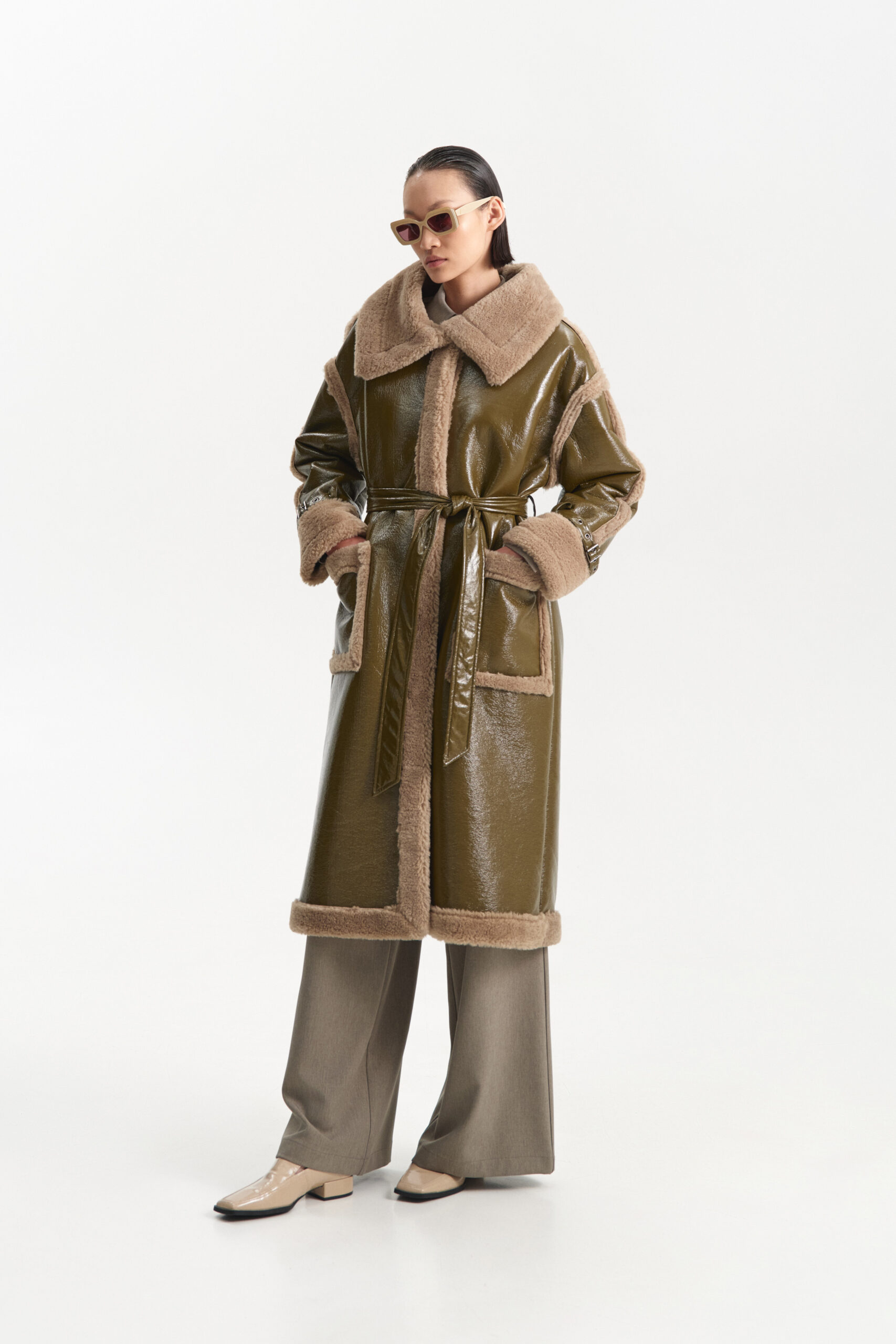 Este abrigo largo para mujer destaca por su diseño moderno y cálido. Fabricado en un tono verde oliva con acabado brillante, incorpora detalles de forro de shearling beige en el cuello, puños, bolsillos y borde inferior, aportando un toque acogedor y lujoso. Incluye un cinturón a juego para definir la cintura y mangas con ajuste en los puños. Perfecto para el invierno, combina estilo y funcionalidad con un aire sofisticado.