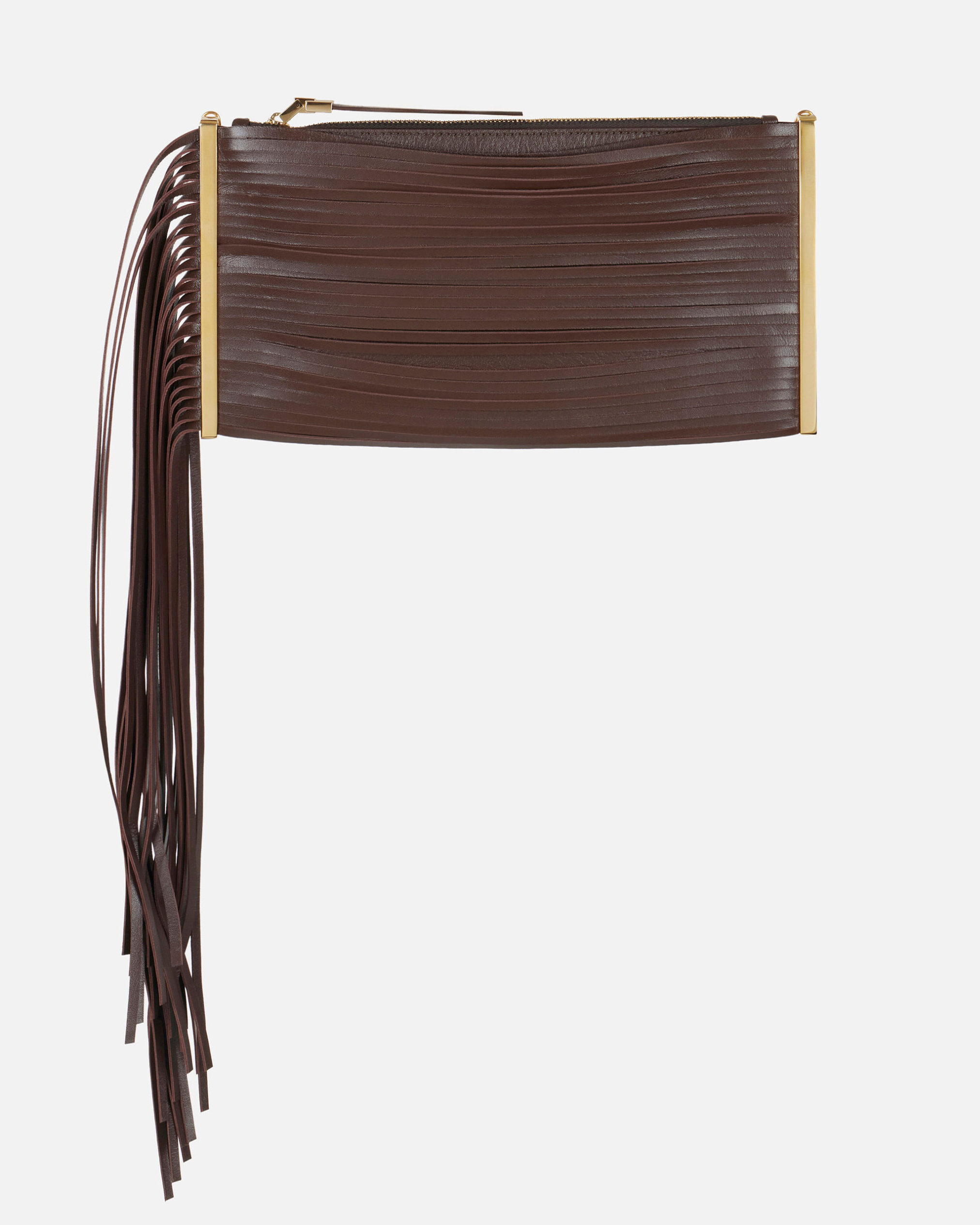 Bolso de piel de napa con correa de cadena. Se distingue por la trama de flecos y las placas de metal dorado en los laterales, que aportan un toque de luz. Cierre con cremallera.