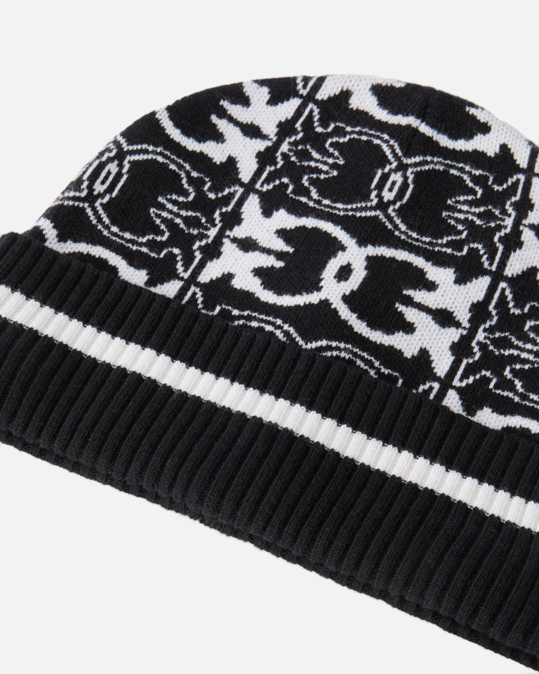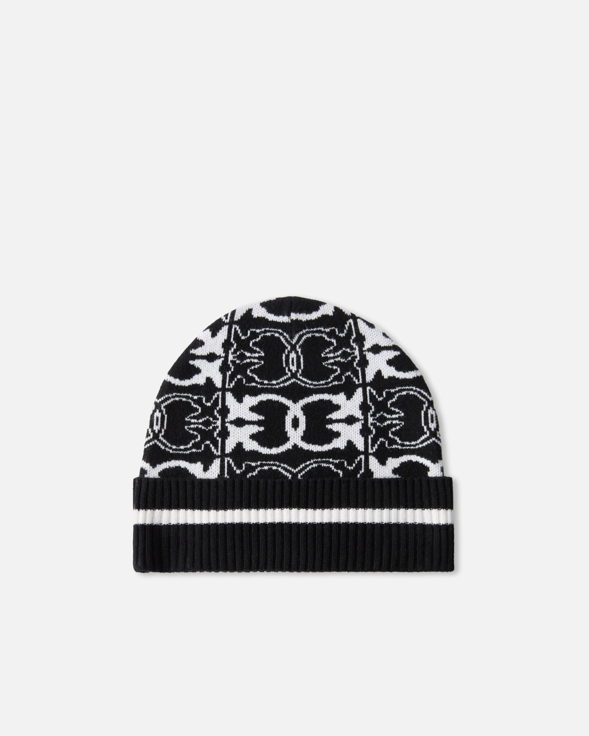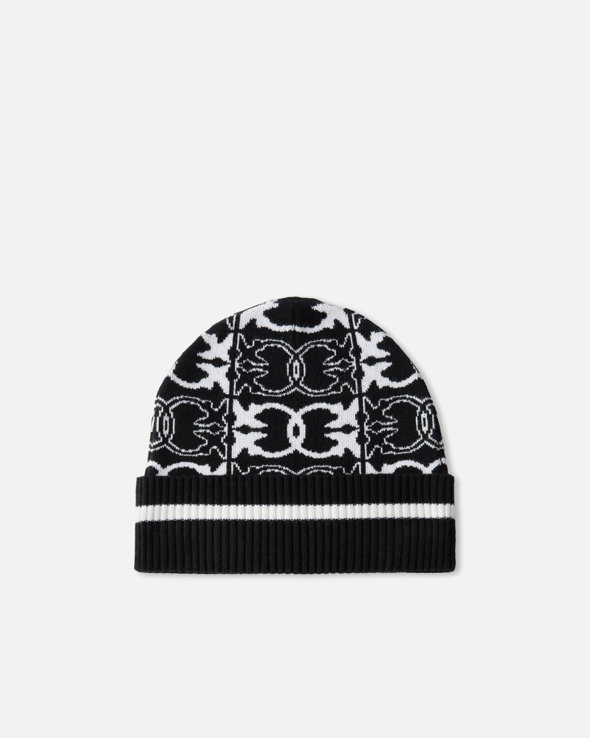 Gorro en suave punto jacquard de mezcla de lana y cachemira, trabajado con un patrón all-over con el icónico logo Love Birds que decora la superficie y da un toque gráfico; construcción de gorra envolvente con costura central, borde acanalado elástico redondeado y puño alto que asegura un ajuste cómodo y protege del frío; la fibra fina ofrece una calidez ligera sin ser pesada, mientras que la confección en punto jersey mantiene su forma uso tras uso; llévelo con una chaqueta de plumas de gran tamaño y pantalones deportivos de polar para un look outdoor relajado pero reconocible.