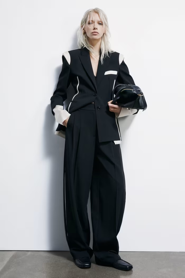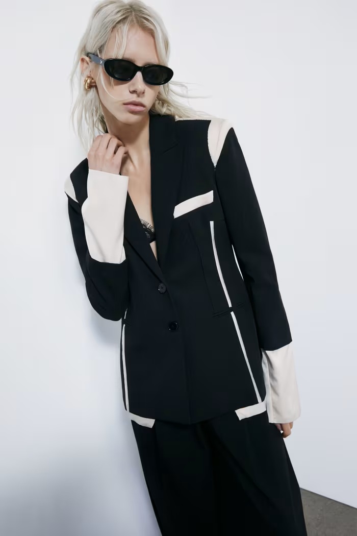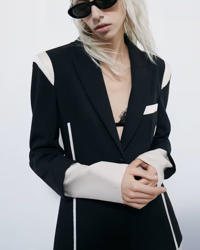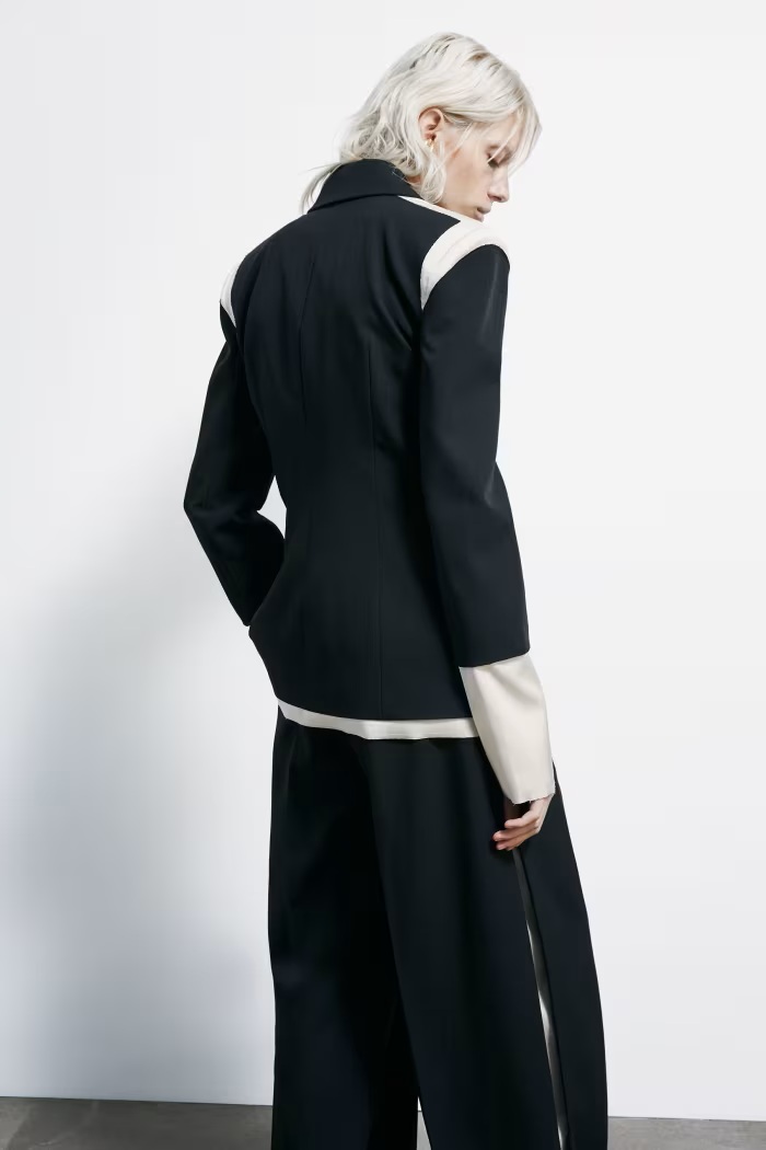 - Piezas de satén en contraste de color en hombros, pecho, bolsillo y mangas