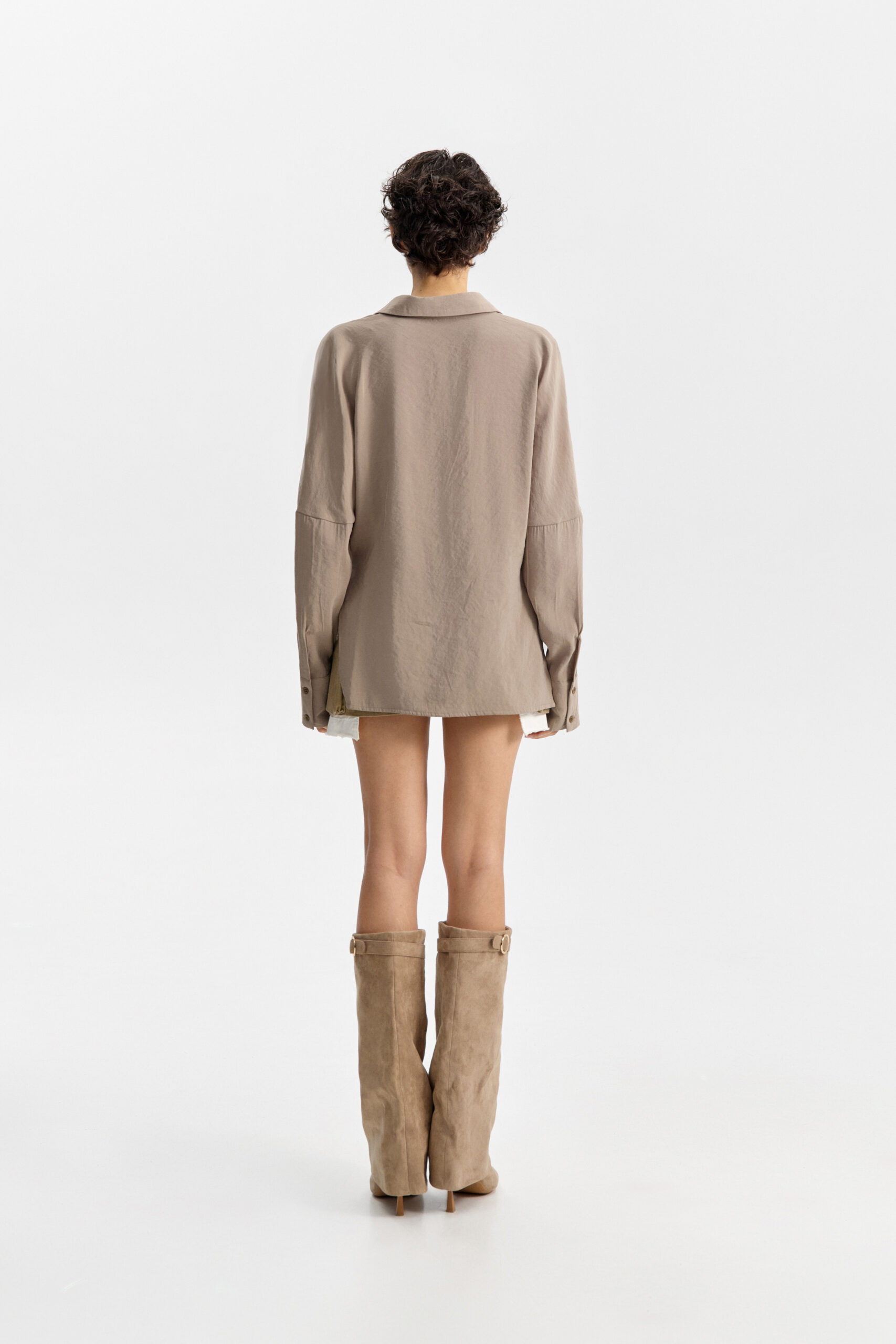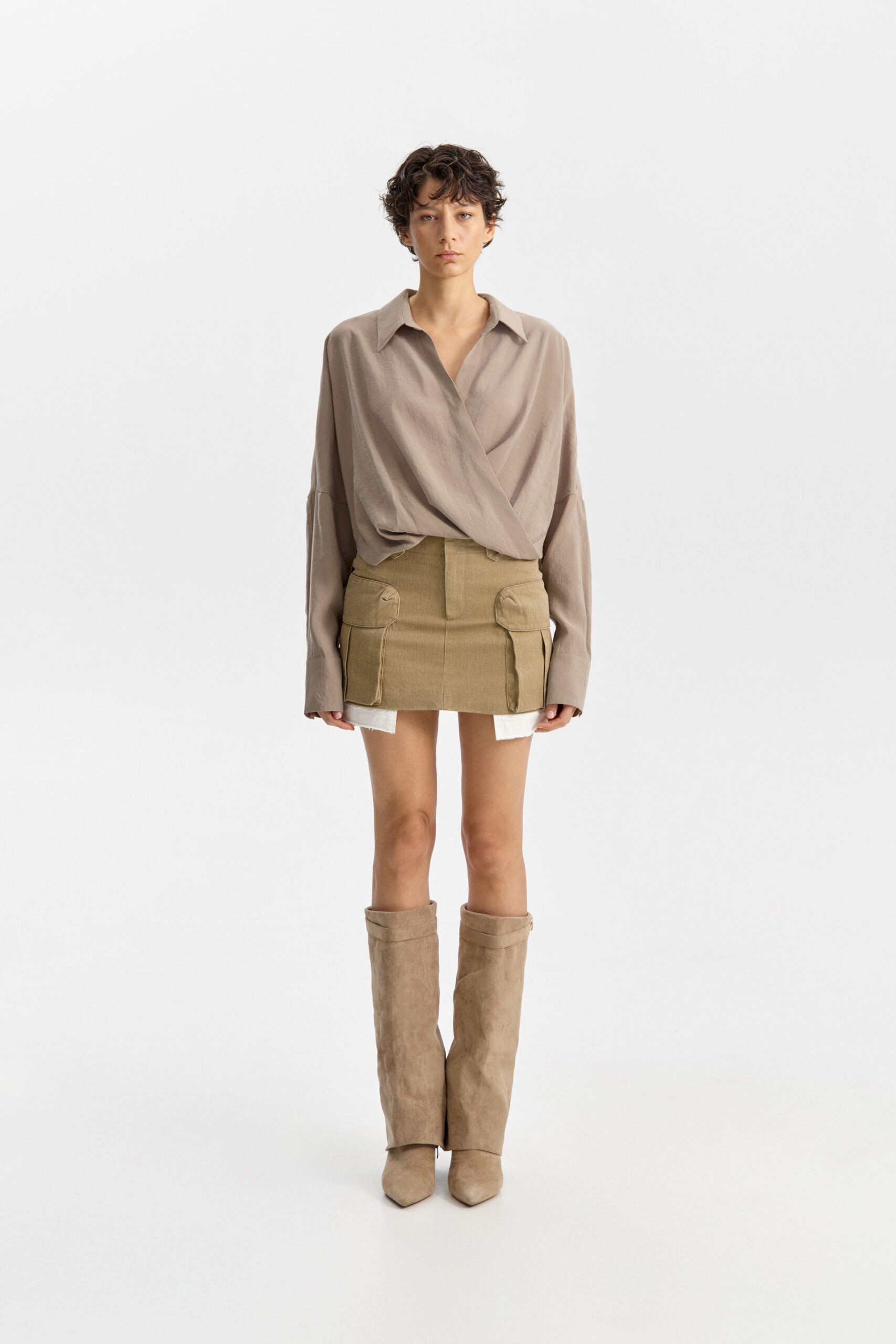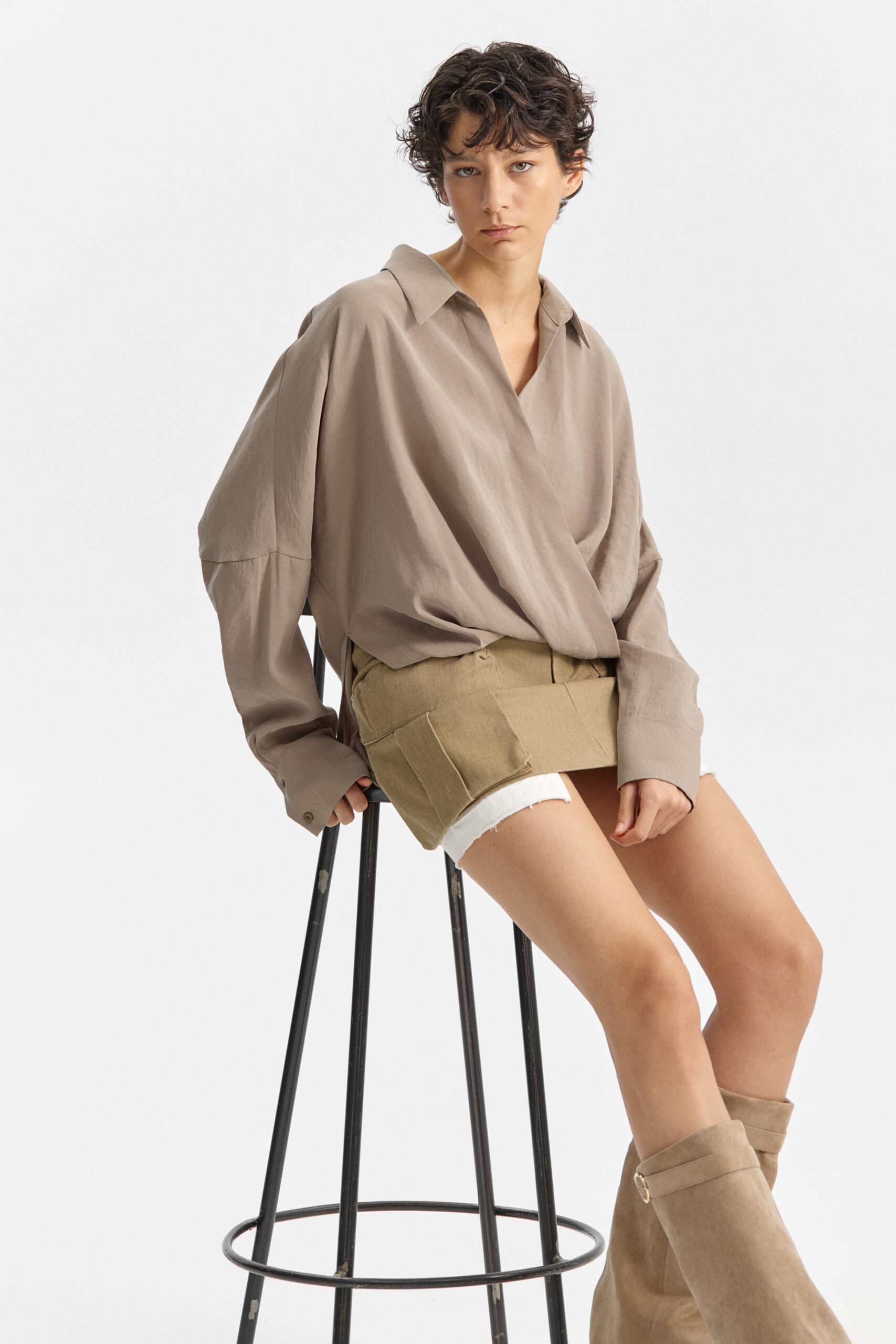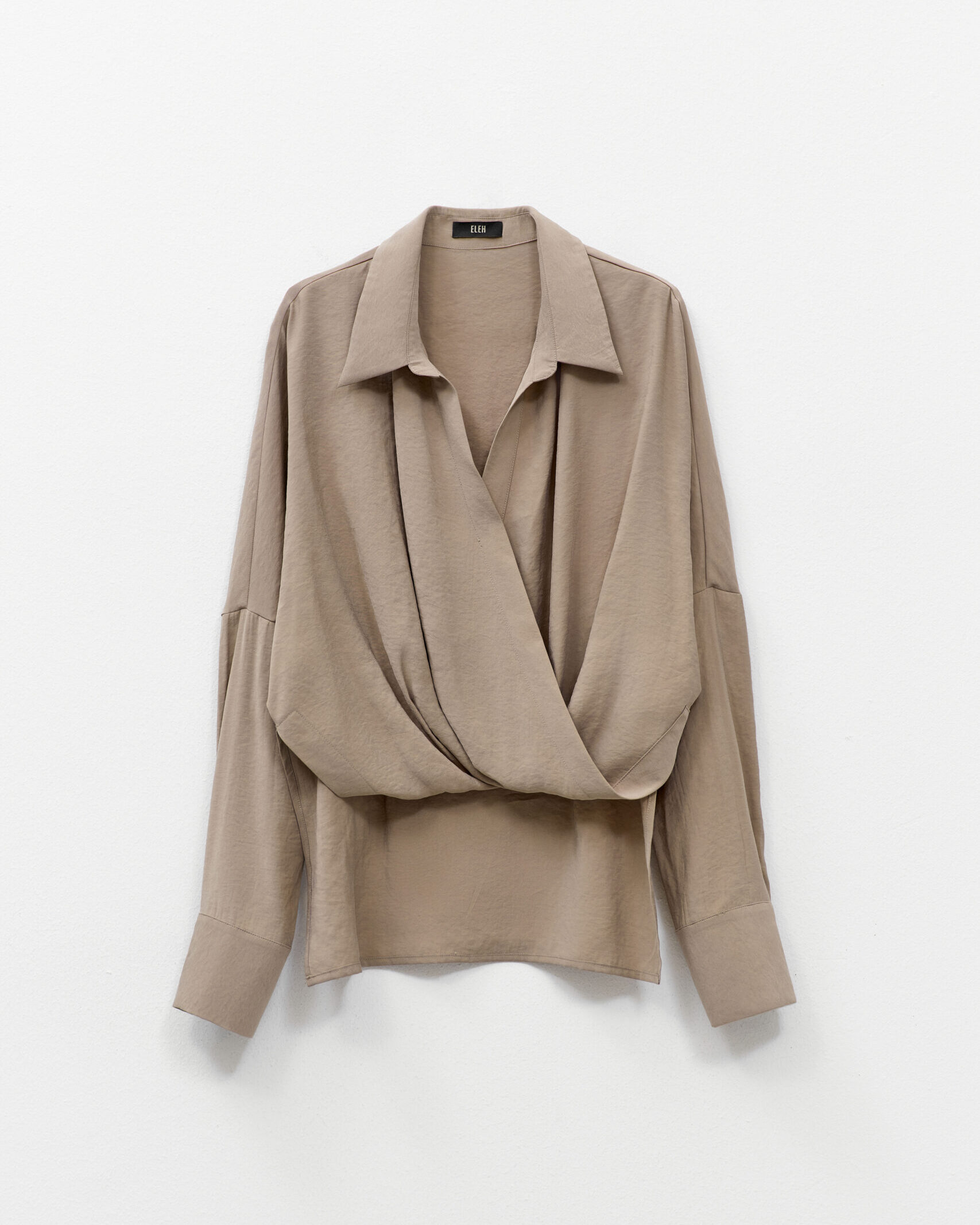 Esta elegante blusa para mujer presenta un diseño fluido en tono beige claro. Confeccionada en un tejido ligero y sedoso, cuenta con un cuello camisero, mangas largas y un detalle de drapeado frontal que añade un toque sofisticado. Perfecta para ocasiones formales o looks de oficina con un estilo versátil y moderno.