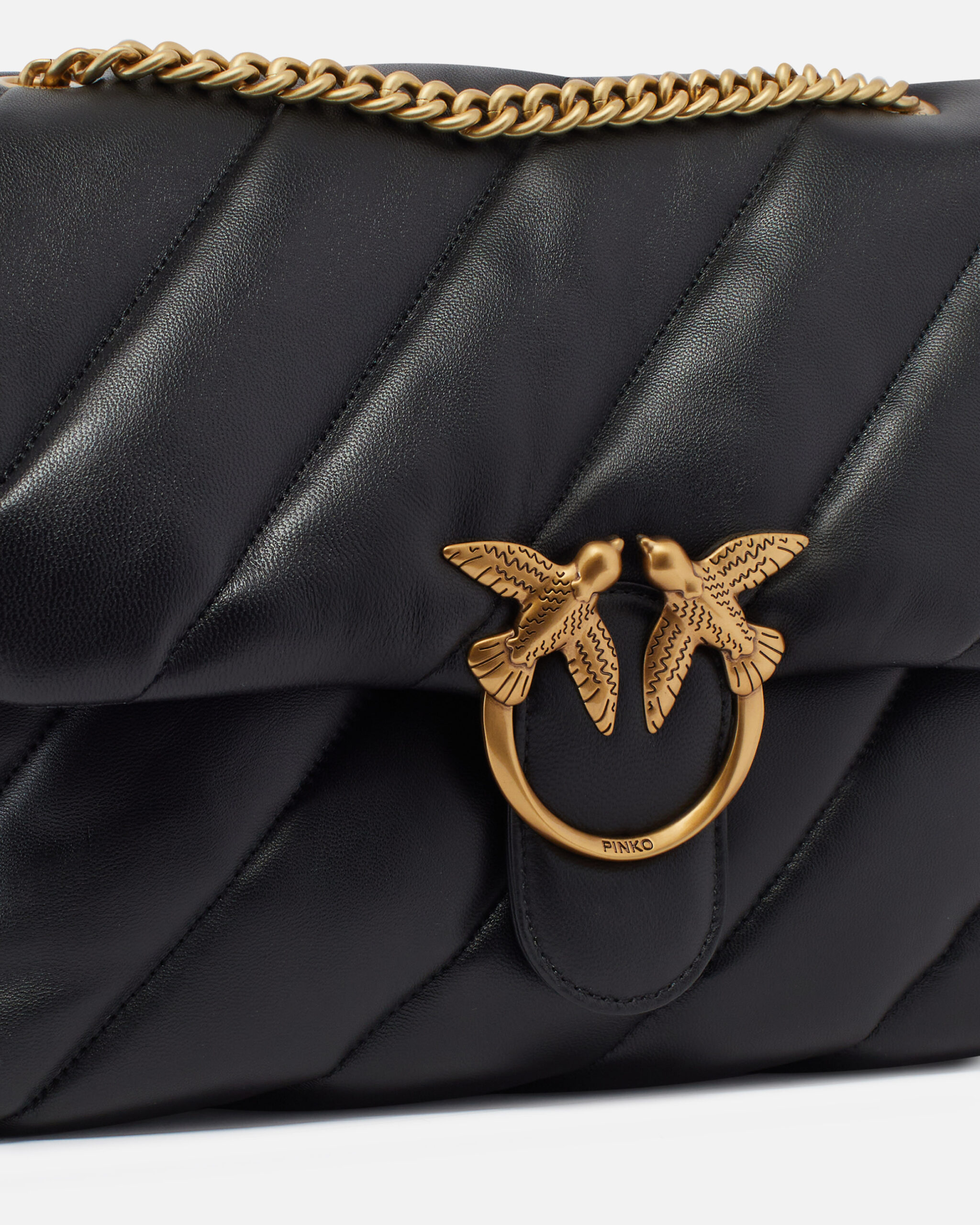 Bolso Big Love Bag Puff de napa suave con maxiacolchado oblicuo. El cierre se completa con la emblemática hebilla Love Birds Diamond Cut de metal. El interior presenta un forro de microfibra con efecto ante e incluye un panel divisorio con cierre de cremallera y un bolsillo interno. La correa combina la clásica cadena redonda de metal con una práctica hombrera de napa.