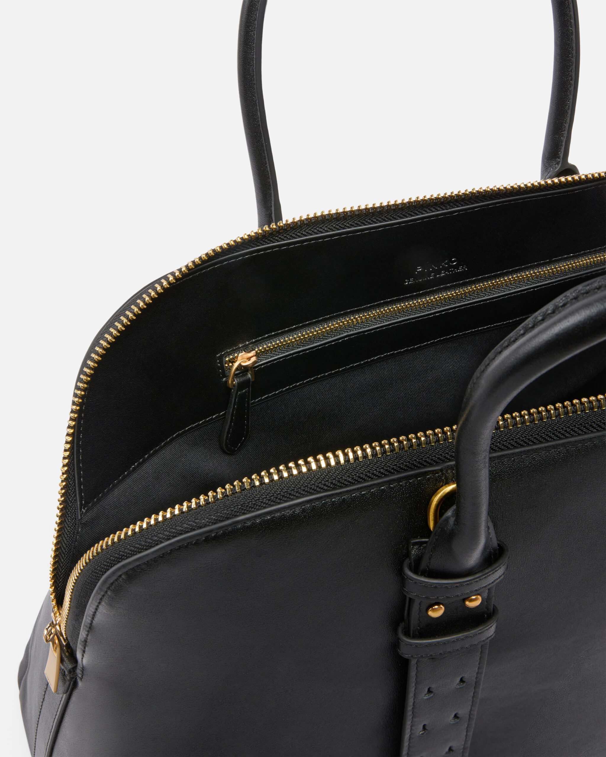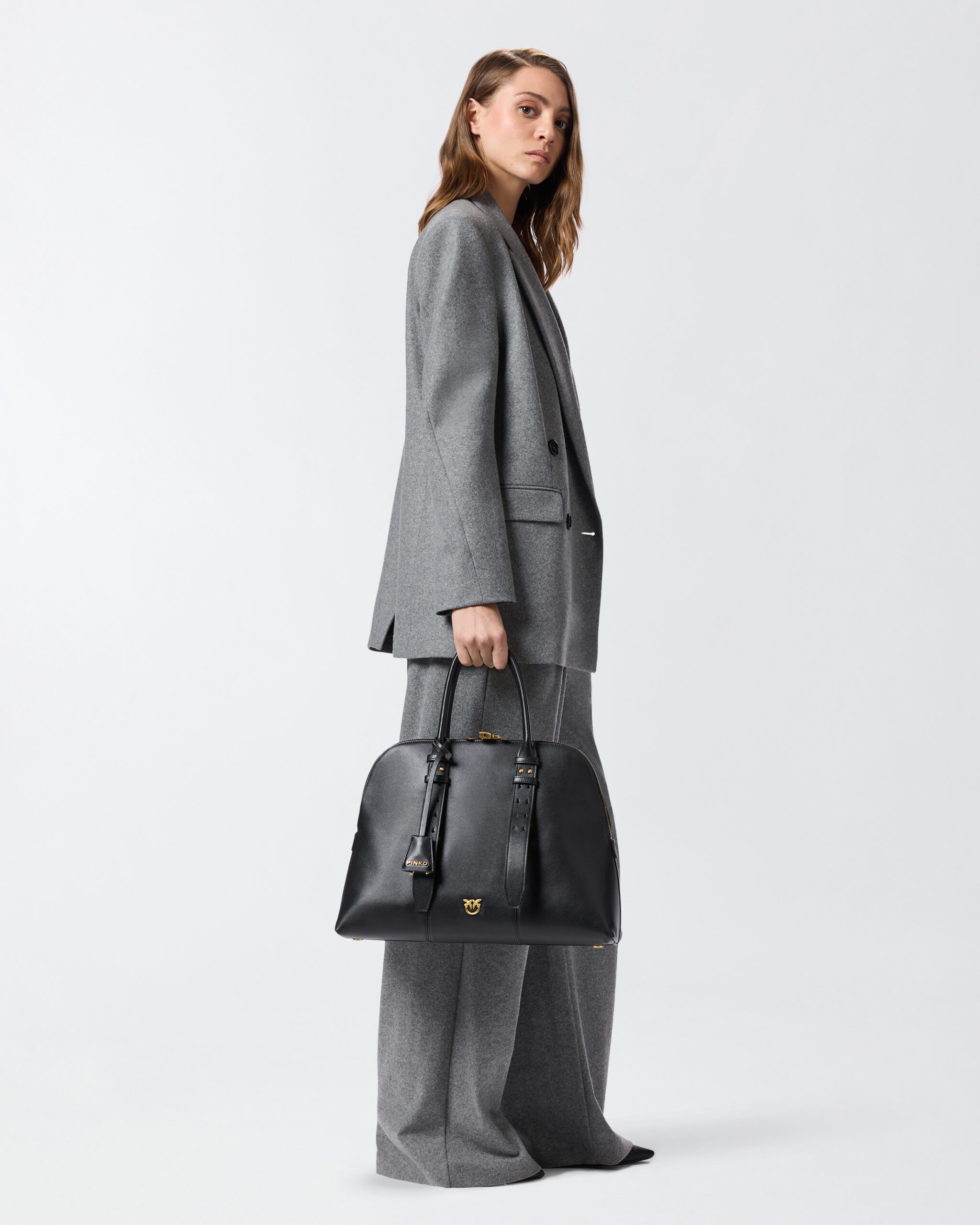 Bolso bowling de mano Escape Bag maxi de piel suave, con forro de algodón y bolsillo plano con tarjetero. Este bolso, que se caracteriza por una correa de piel ajustable y extraíble y un asa doble para llevarlo en la mano o al hombro, es extremadamente versátil y práctico. El cierre superior con cremallera de doble cursor está personalizado con un detalle inédito: un candado decorado con el icónico logotipo Love Birds que se puede abrir y cerrar gracias a la llave contenida en el abalorio de piel que completa el bolso. ¡Activa tu bolso PINKO: verifica la autenticidad de tu producto y accede a la experiencia personalizada acercando tu smartphone al bordado Love Birds que encontrarás en la parte posterior del bolso!