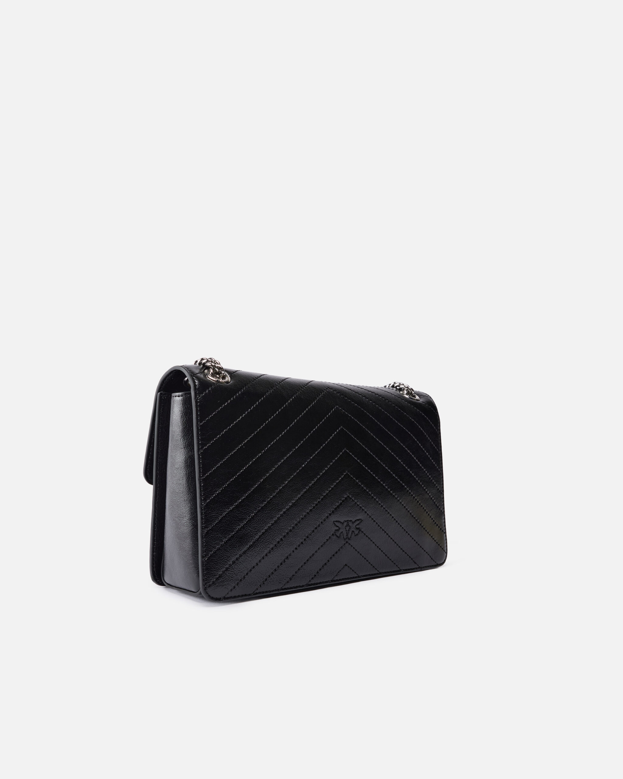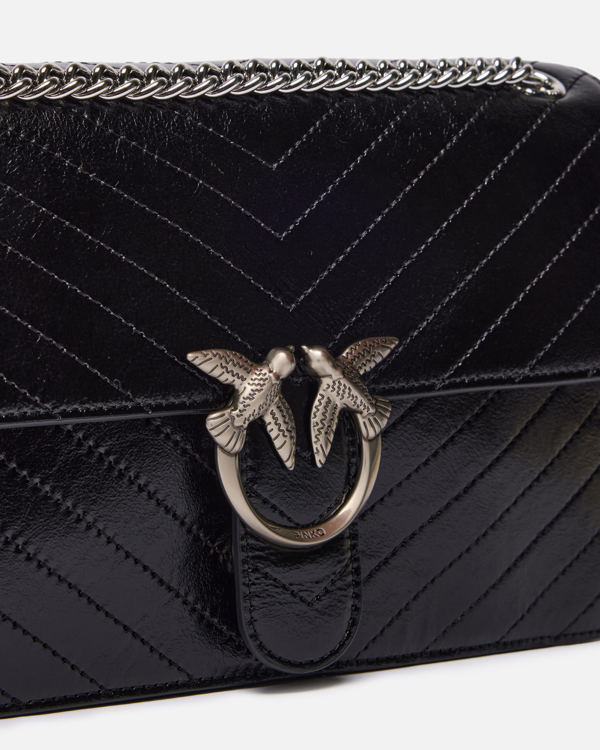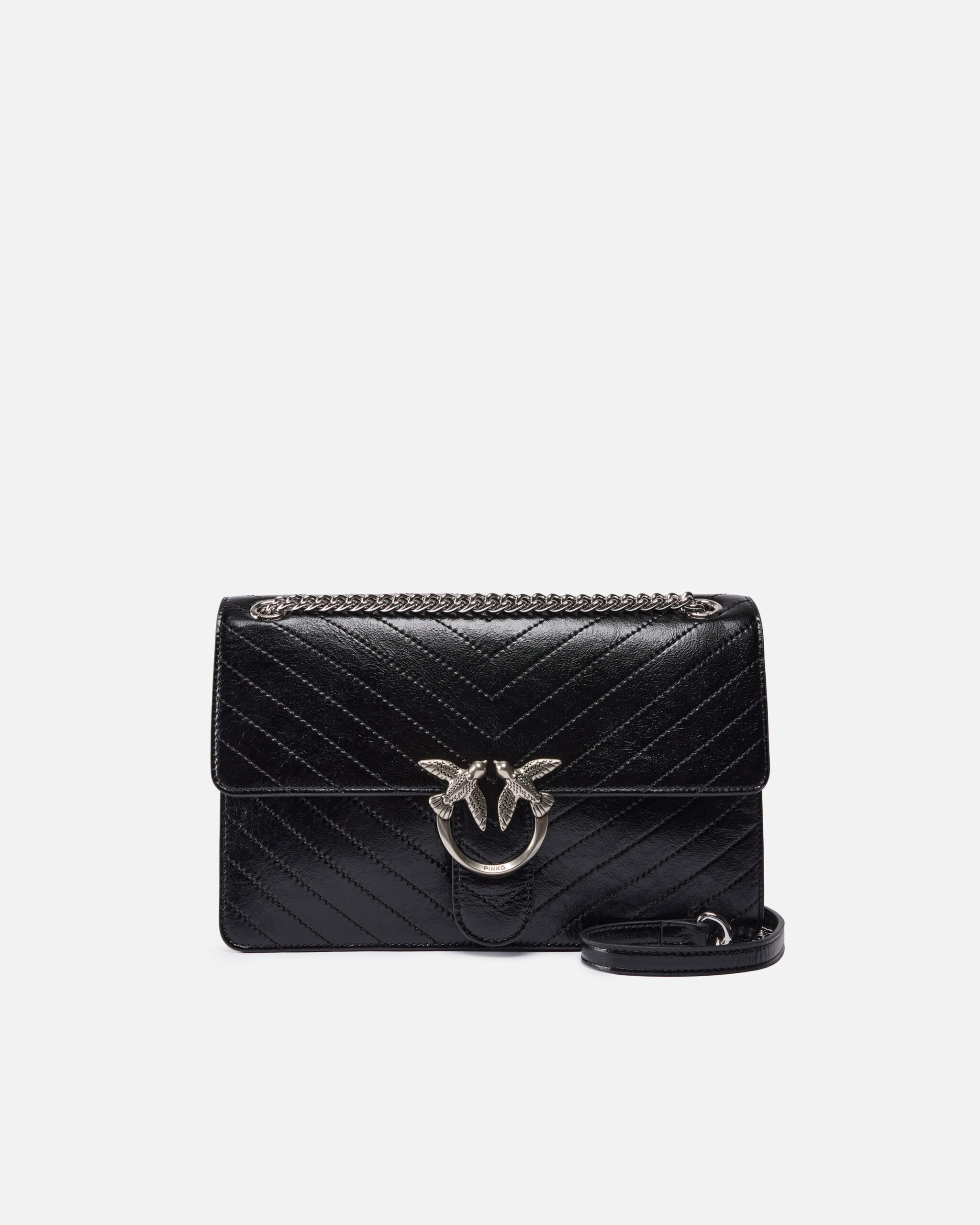 Bolso Love Bag One de tamaño mediano y construcción ligera realizado en piel con textura arrugada y adornado con un motivo de chevrón. El modelo incluye una correa de cadena con hilo redondo y una hombrera de piel, que permite llevar el accesorio de tres formas diferentes: en la mano, cruzado y al hombro. El bolso es contemporáneo y refinado, mientras que la hebilla Love Birds Diamond Cut en el cierre de pasador se convierte en portavoz del inimitable estilo PINKO. El interior presenta un forro de dril de algodón e incluye un bolsillo plano con cierre de cremallera. ¡Activa tu bolso PINKO: verifica la autenticidad de tu producto y accede a la experiencia personalizada acercando tu smartphone al bordado Love Birds que encontrarás en la parte posterior del bolso!