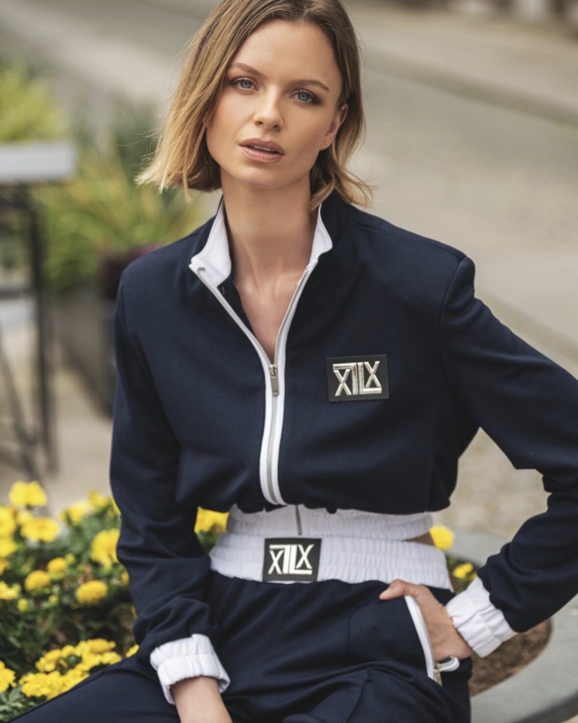 La bomber cropped que fusiona sportswear y moda! En azul marino profundo con contraste blanco en cuello, puños y bajo.