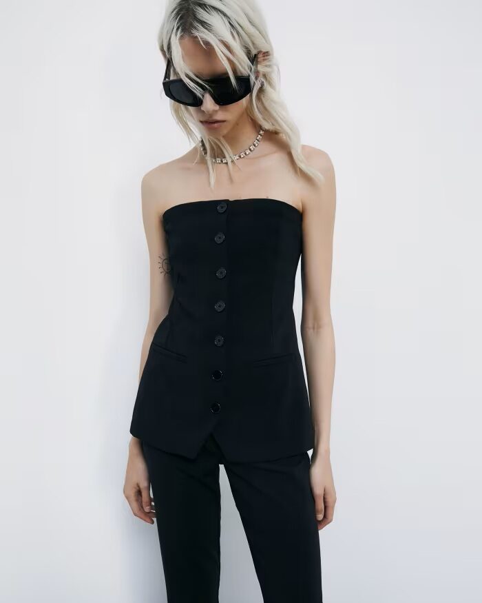 Parte de la colección Party Drop, este top es perfecto para tus próximas salidas nocturnas. Confeccionado en crepé elástico, este bustier esculpe la parte superior del cuerpo con una línea definida y moderna. Su estructura entallada y sutiles detalles de botones le dan un acabado contemporáneo. Llévalo con los pantalones entallados a juego o con una falda fluida de satén para jugar con los contrastes.