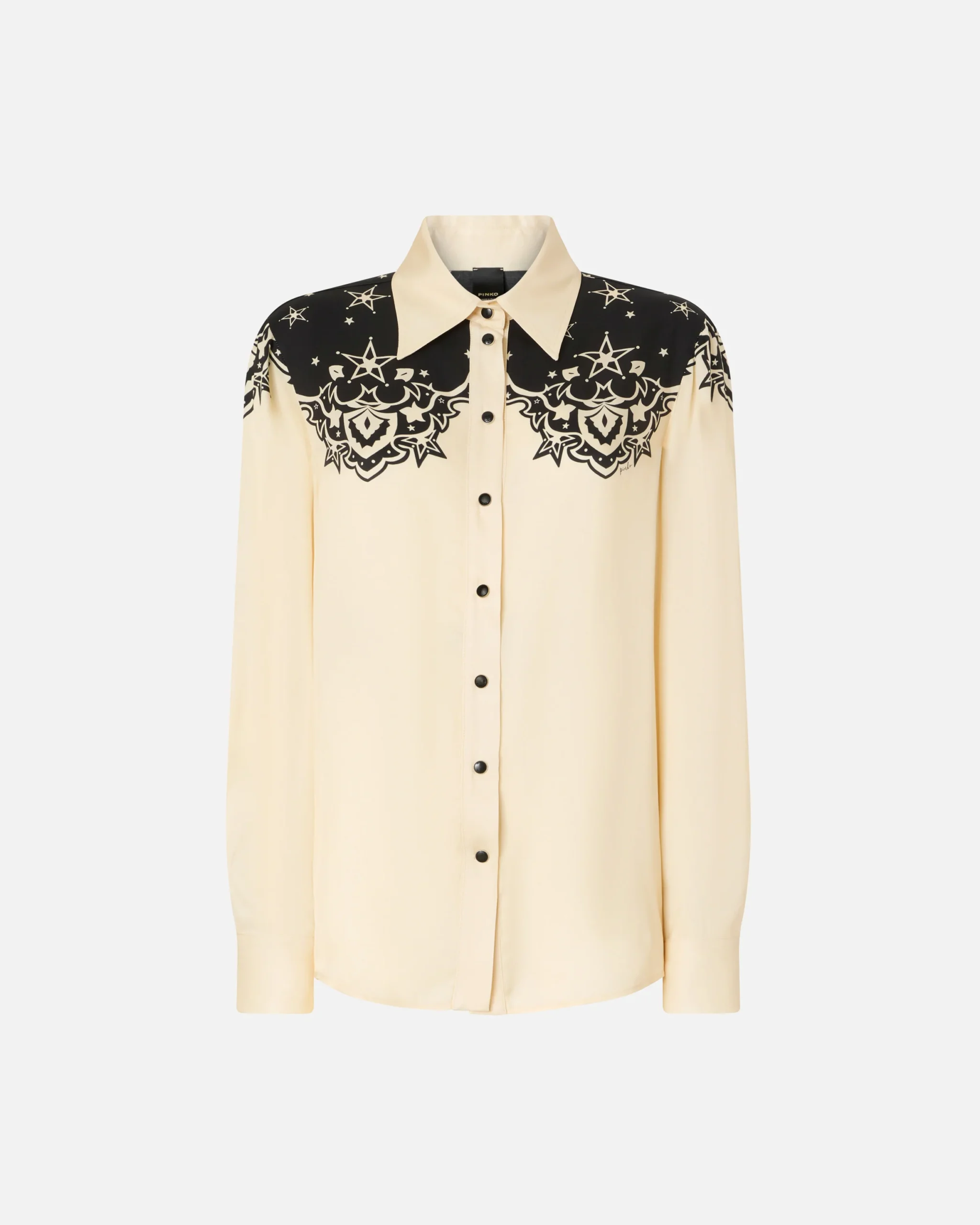 Camisa de manga larga con cuello clásico y cierre delantero con botones a contraste confeccionada en sarga de pura viscosa. La prenda se distingue por el original estampado aplicado con estrellas, también a contraste, que recrea el efecto de un canesú y que evoca las decoraciones típicas de las camisas del Oeste. Llévala combinada con unos vaqueros de talle alto para un look más informal o elige unos pantalones sastre y un blazer para crear un interesante juego de estilos y proporciones.