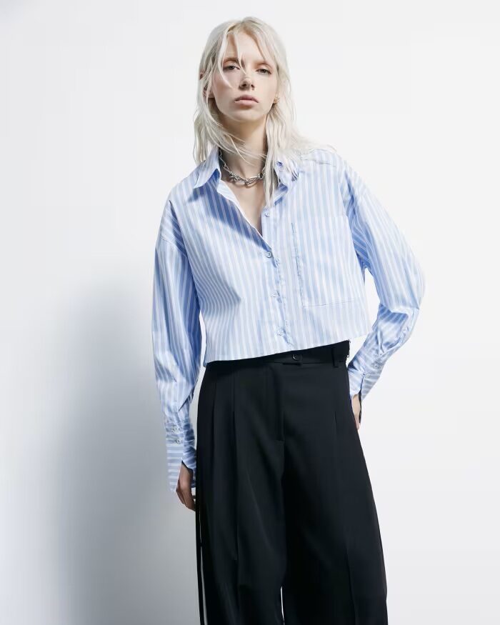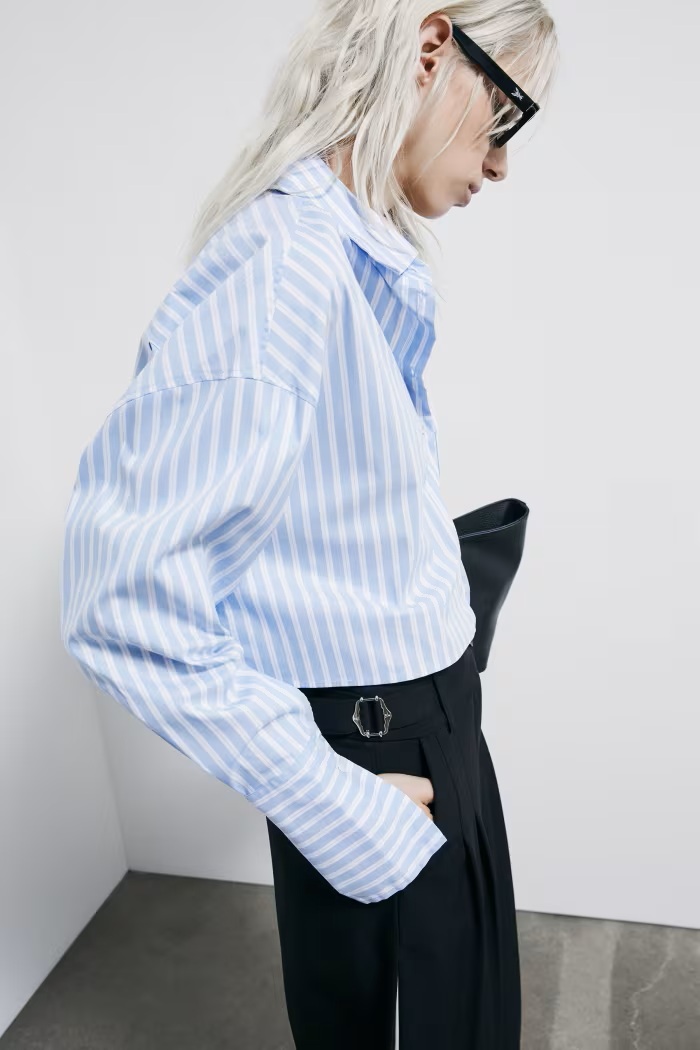 Camisa de rayas de popelina de algodón con ajuste holgado y corte cropped: un imprescindible del vestuario reinterpretado para conjuntos versátiles con un toque urbano glamuroso.