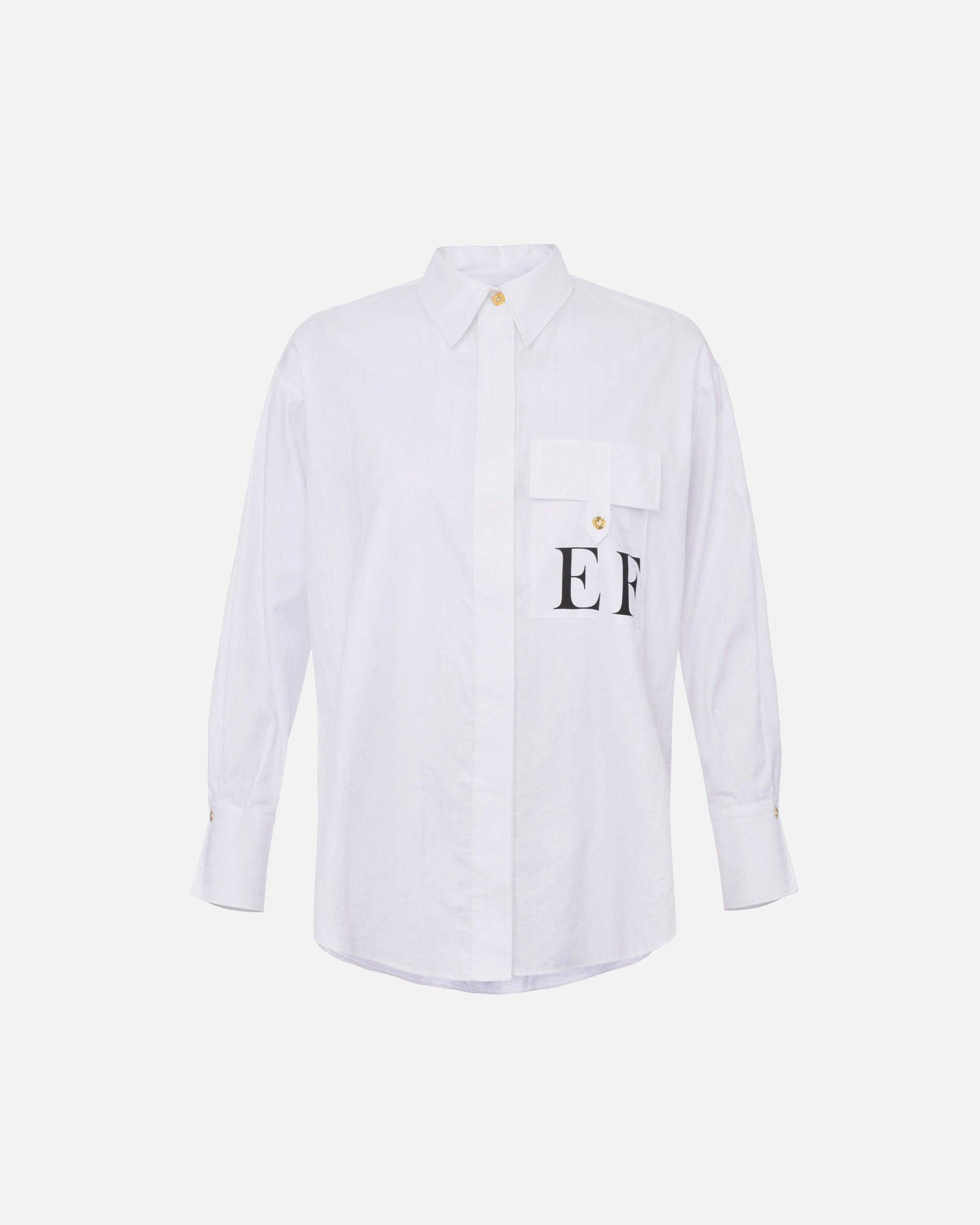 Camisa de popelina de algodón de talla oversize. Presenta un cuello clásico, mangas largas con puños altos y un bolsillo con ojal personalizado con botón de metal dorado y logotipo estampado de color en contraste. Las rayas a tono brindan una refinada ligereza.