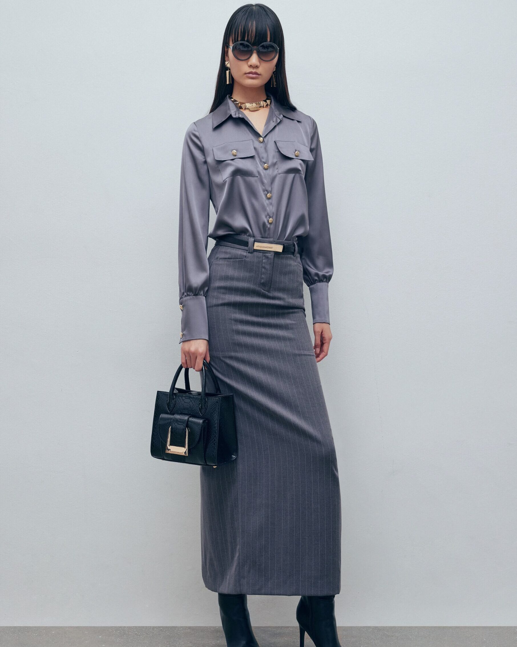 Explora la blusa de raso gris, una prenda esencial que combina elegancia atemporal con un acabado sedoso y brillante. Fabricada en raso de alta calidad, esta blusa gris suave ofrece un tacto lujoso y un ajuste cómodo, ideal para looks de día o noche. Su diseño incluye un corte fluido, mangas largas y un cierre frontal discreto, perfecto para estilizar con pantalones tailoring o faldas lápiz.