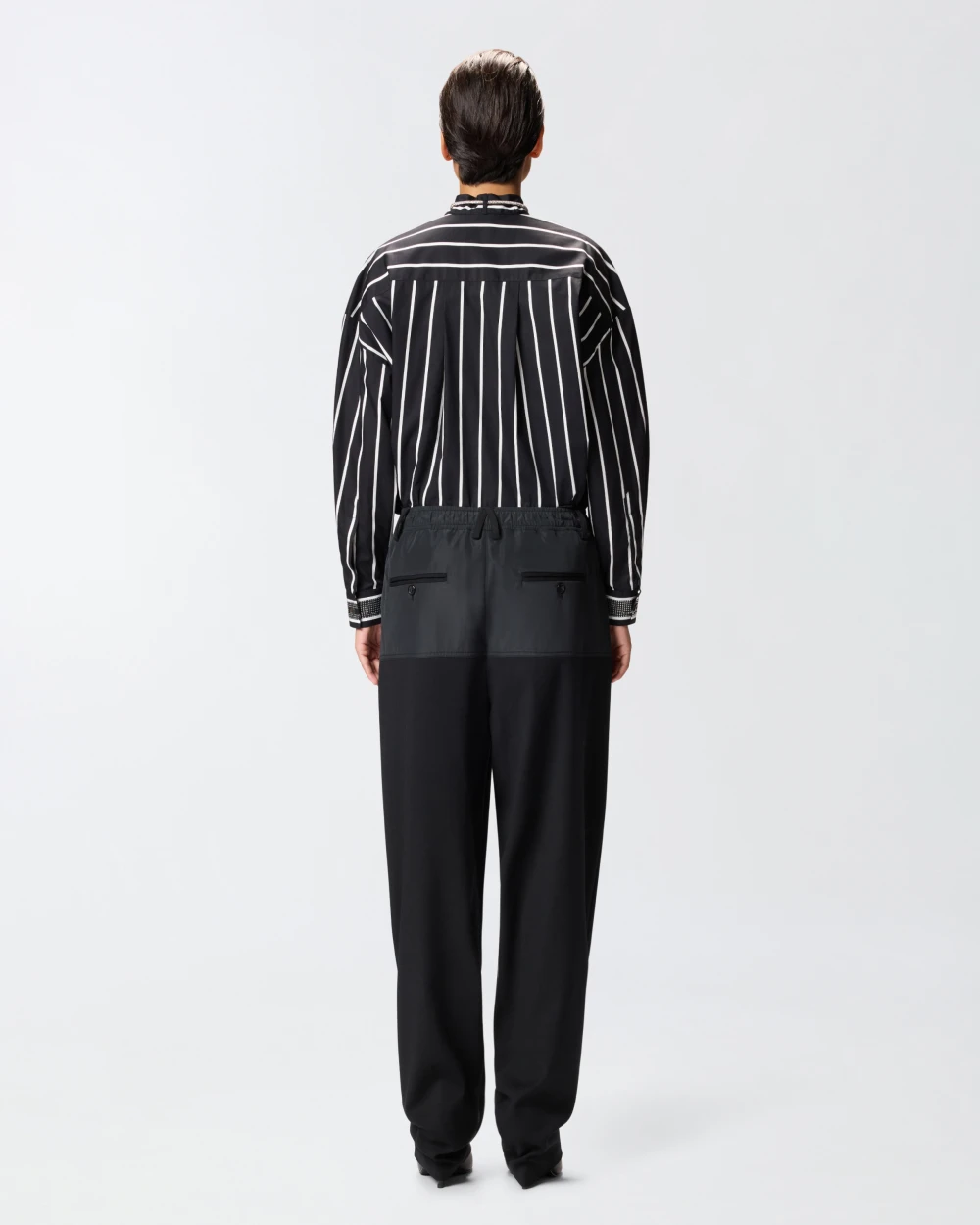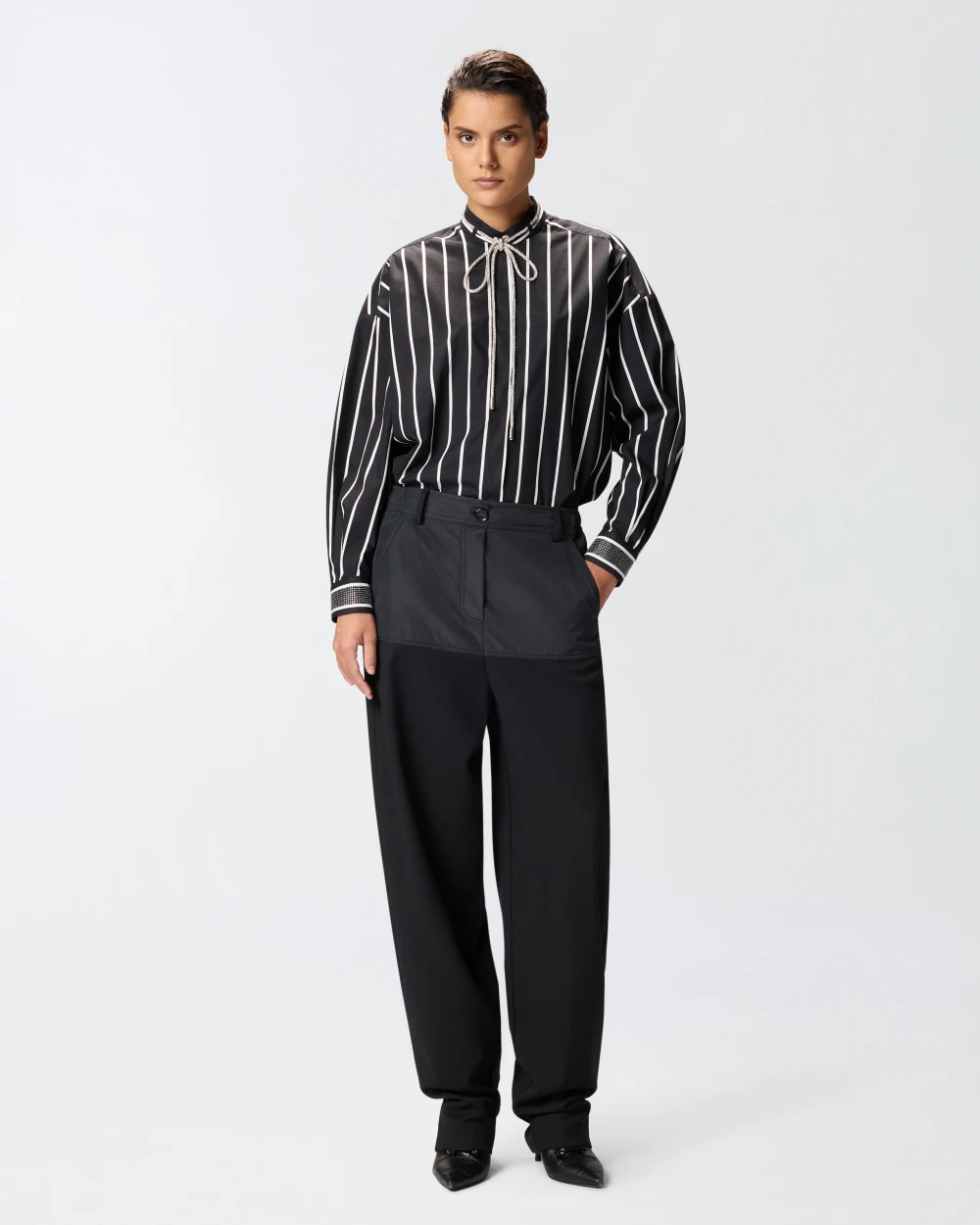 Camisa clásica ligeramente oversize con un estampado de rayas verticales en contraste. El modelo tiene bajo recto y cierre frontal oculto, y está adornada con un cuello invertido con cordones cubiertos de pedrería, que también se encuentra en los puños de las mangas largas. Combínala con pantalones negros para un look elegante y femenino.