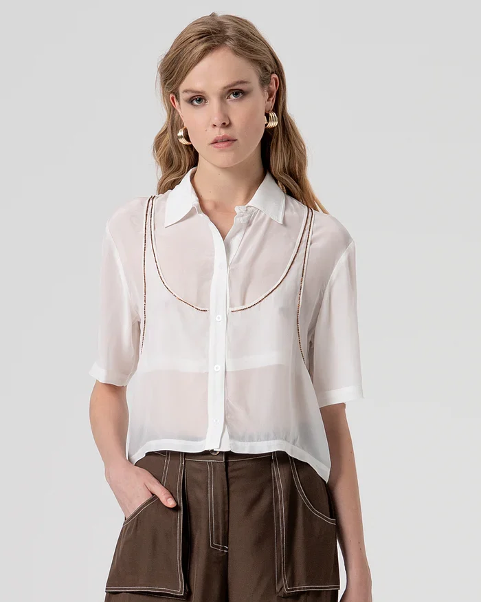 Camisa corta sin mangas confeccionada en viscosa. Cuello de corte clásico, botones centrales para abrir, pedrería y mangas cortas.