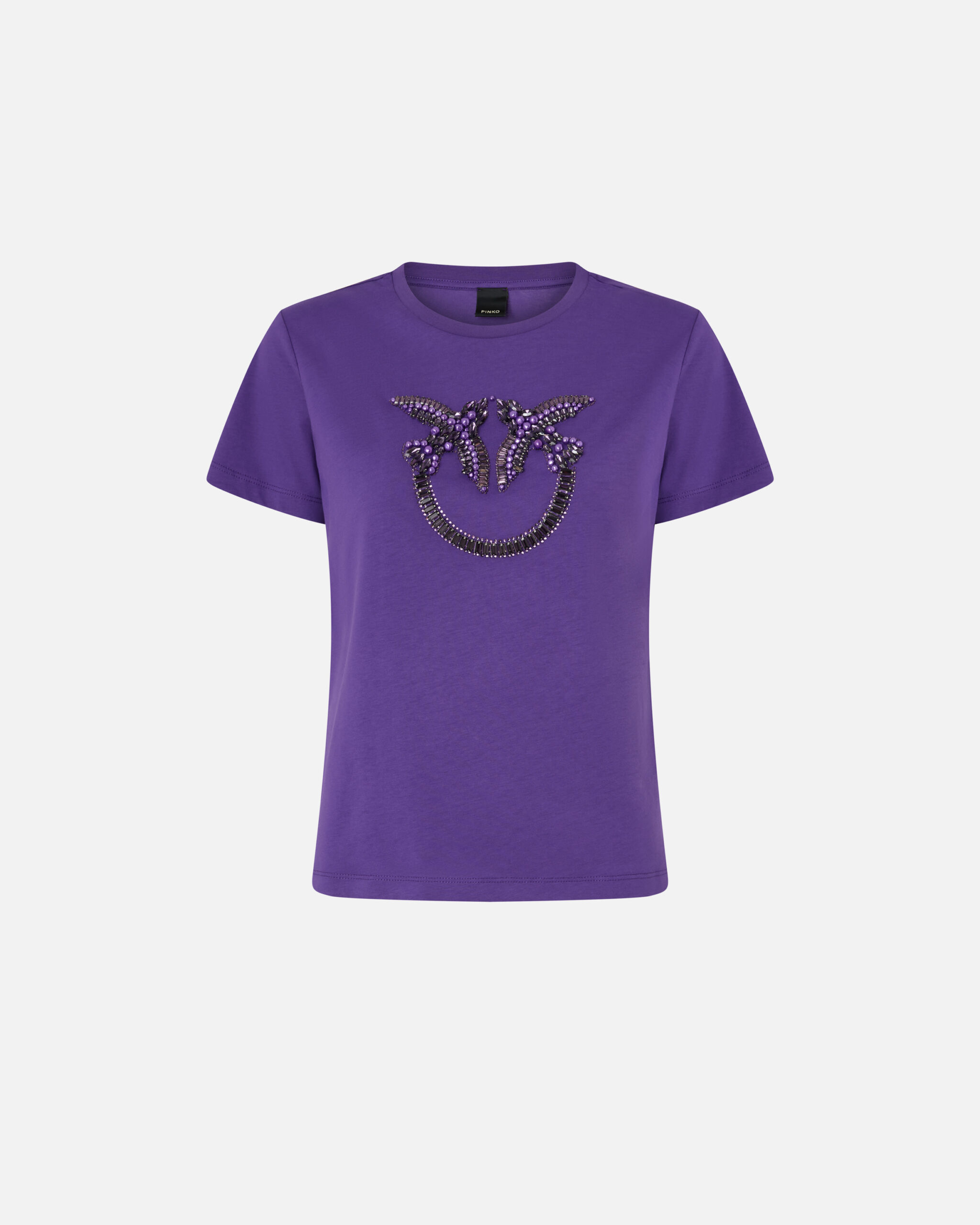 Camiseta de manga corta de jersey de algodón. Esta prenda está adornada con el logo de Love Birds, decorado con un bordado a mano compuesto por perlas, una cadena de cristales con corte baguette y pedrería de diferentes formas sujeta con garras especiales en los laterales para mayor seguridad. Esta camiseta es perfecta para cualquier ocasión, desde formal hasta deportiva, y le aporta un toque icónico y femenino.