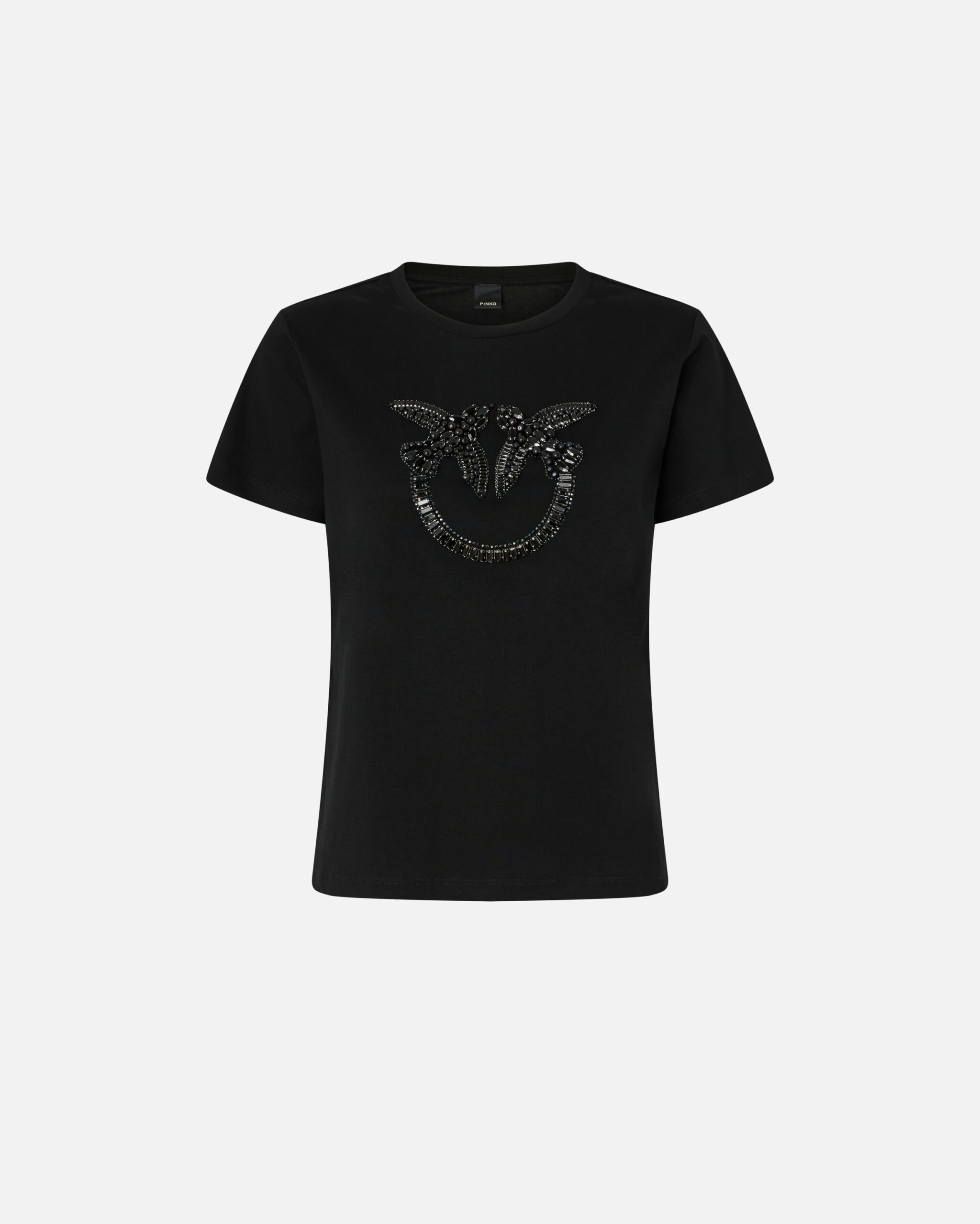 Camiseta de manga corta de jersey de algodón. Esta prenda está adornada con el logo de Love Birds, decorado con un bordado a mano compuesto por perlas, una cadena de cristales con corte baguette y pedrería de diferentes formas sujeta con garras especiales en los laterales para mayor seguridad. Esta camiseta es perfecta para cualquier ocasión, desde formal hasta deportiva, y le aporta un toque icónico y femenino.