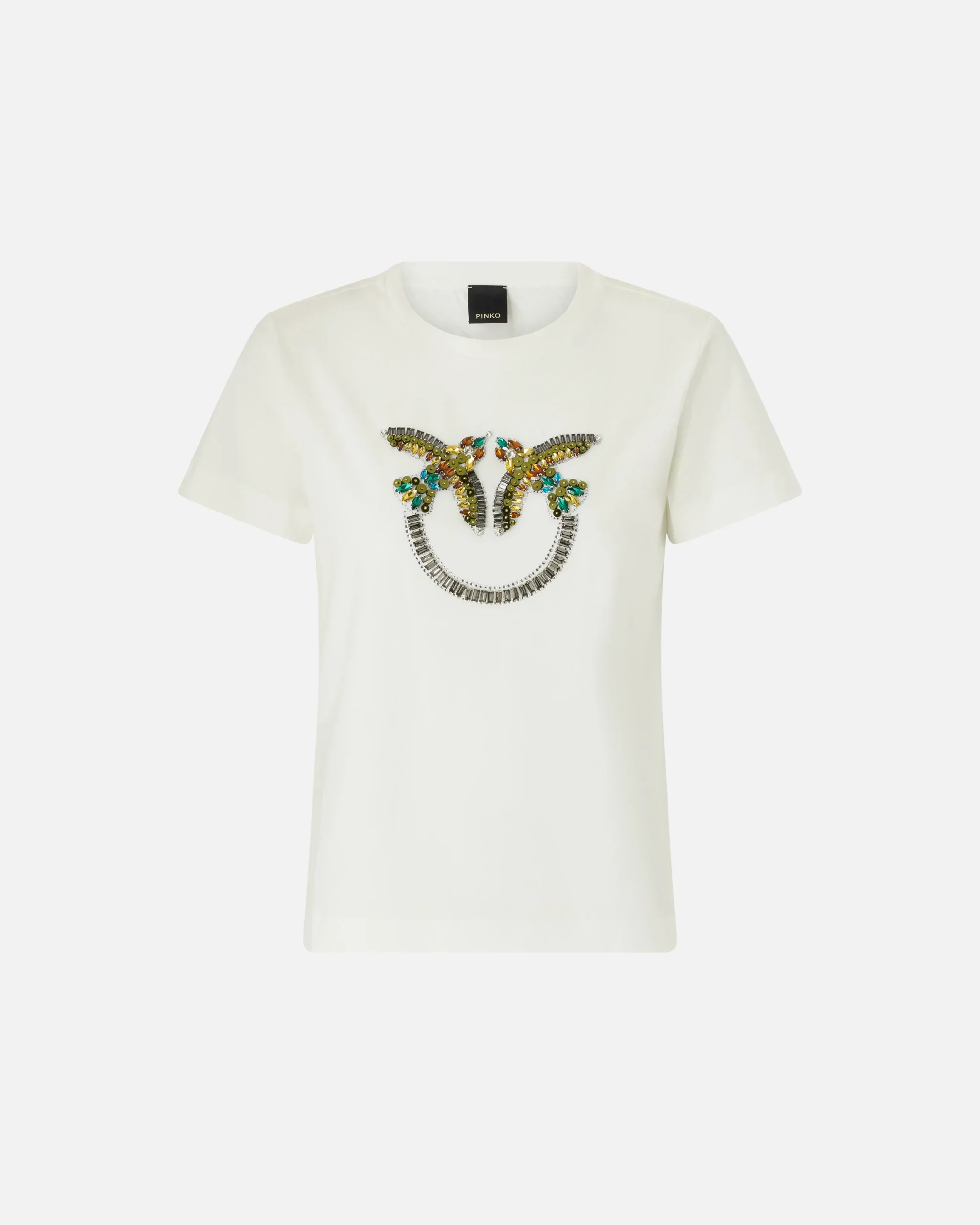 Camiseta de manga corta con cuello redondo confeccionada en suave punto de algodón. Las líneas esenciales del modelo se realzan con el maxibordado joya en el pecho formado por brillantes cristales y lentejuelas multicolores que dan vida al inconfundible logotipo Love Birds. Ponte la camiseta con tus vaqueros favoritos para dar a tus conjuntos informales un toque brillante al más puro estilo PINKO.