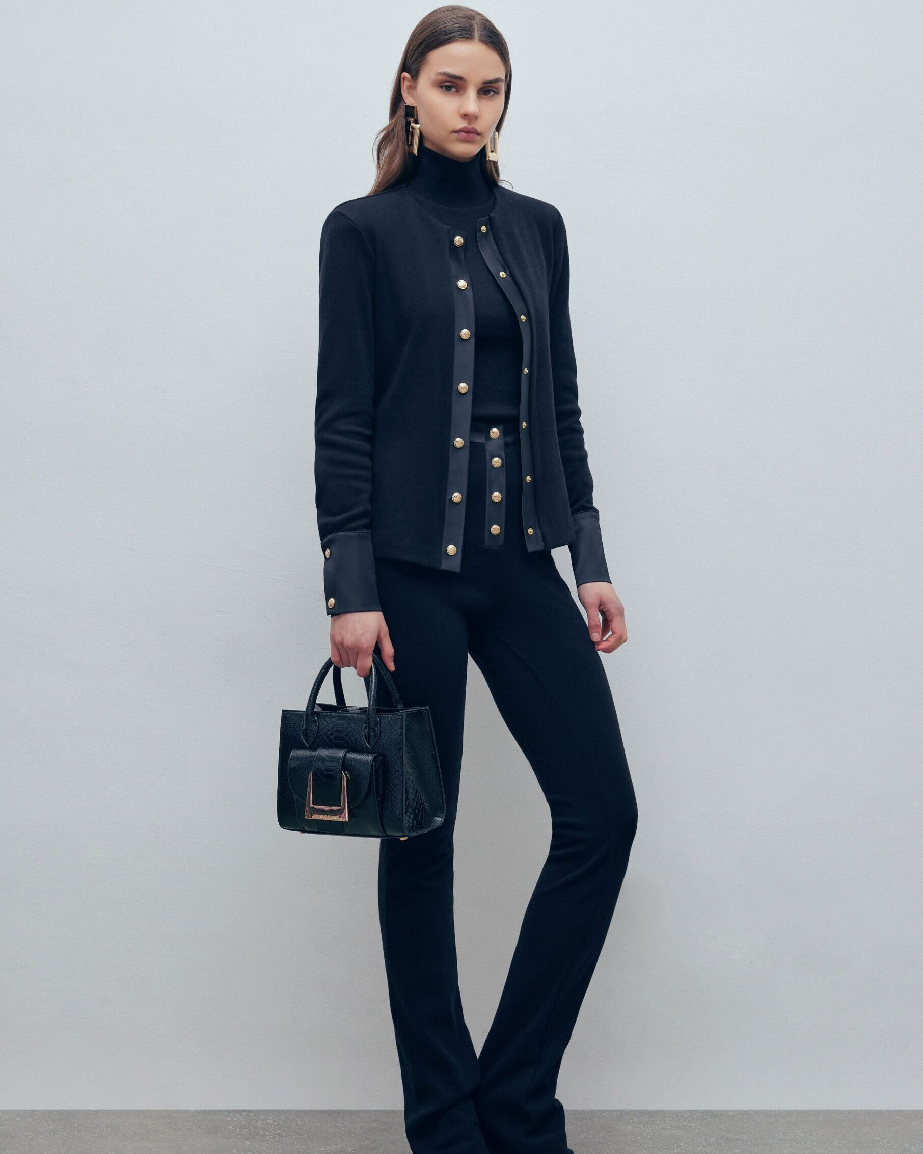 Descubre el elegante cardigan negro con botones dorados, cuello alto y puños contrastantes, ideal para un look sofisticado y versátil. Este suéter abierto se combina perfectamente con pantalones negros acampanados y accesorios minimalistas como pendientes largos dorados y bolso estructurado. Perfecto para outfits de oficina o eventos formales.