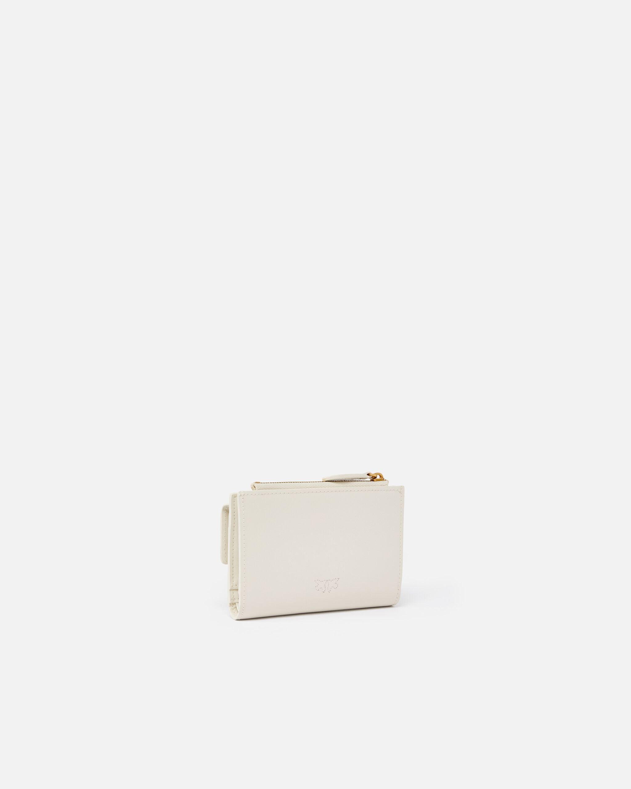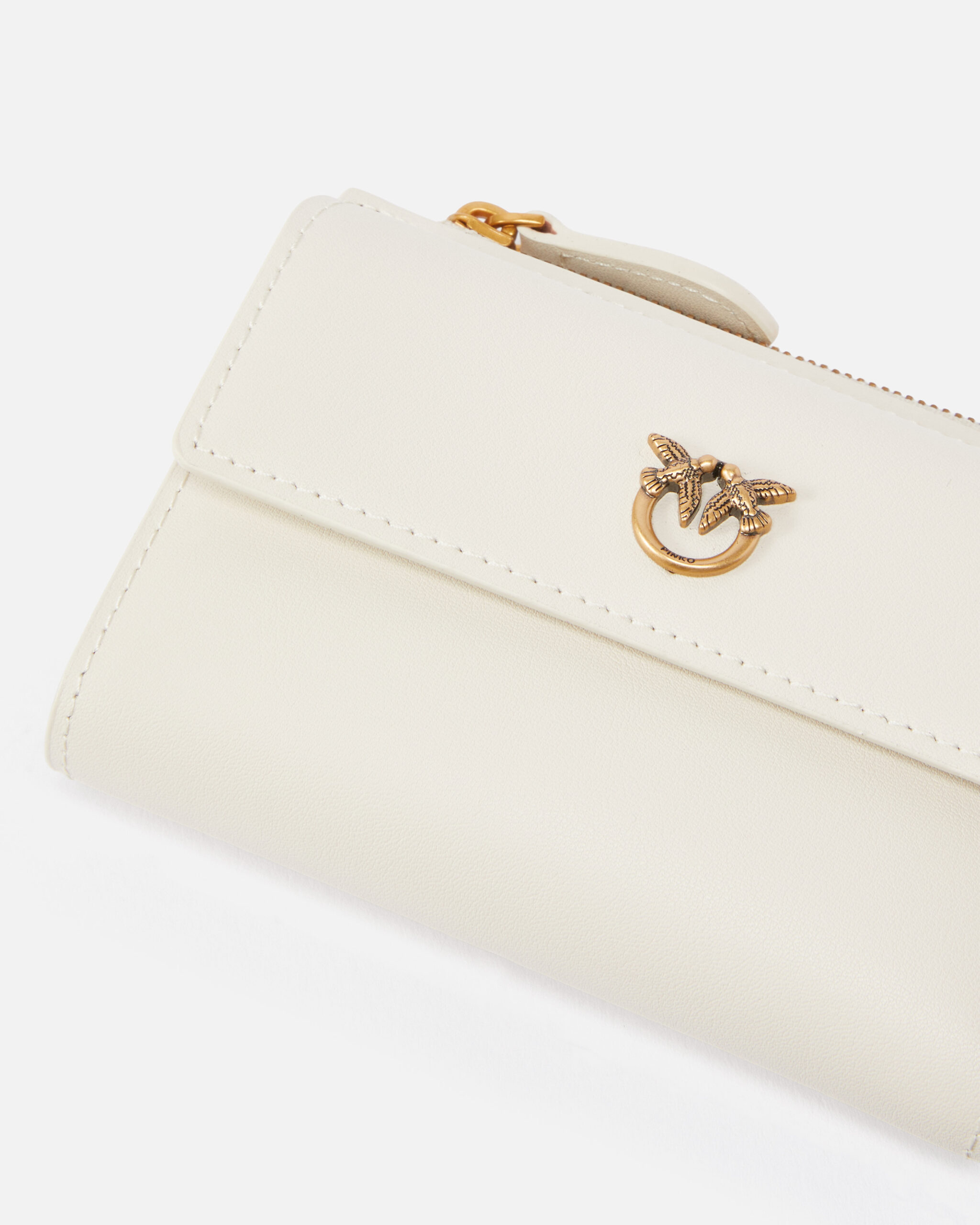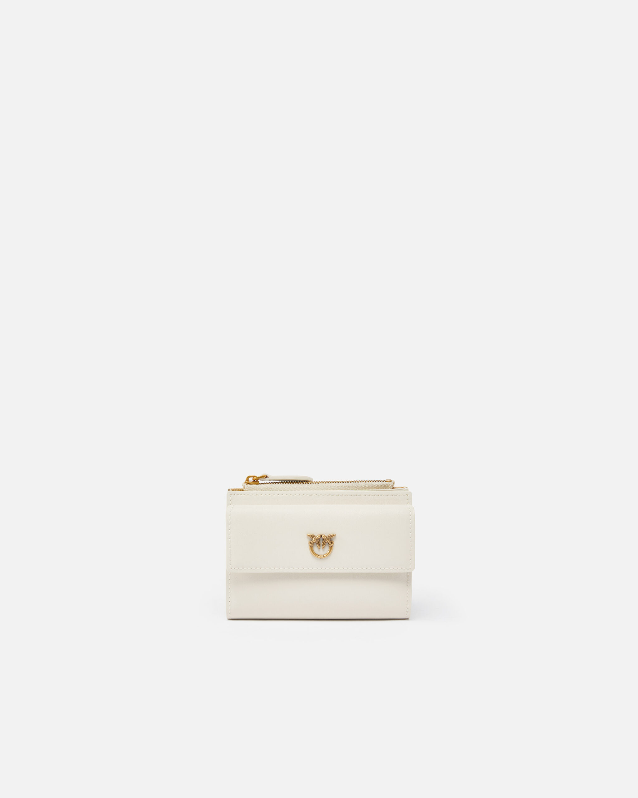 Cartera compacta y multifuncional de tamaño pequeño con forma rectangular realizada en piel suave al tacto con acabado liso. El interior de la cartera está bien organizado con varios compartimentos para tarjetas, mientras que el exterior se completa con un compartimento para monedas, cerrado con una solapa adornada con una pequeña placa de metal con el logotipo Love Birds Diamond Cut. La cartera se cierra con un botón interior para mantener su diseño compacto, perfecto incluso para los bolsos más pequeños.