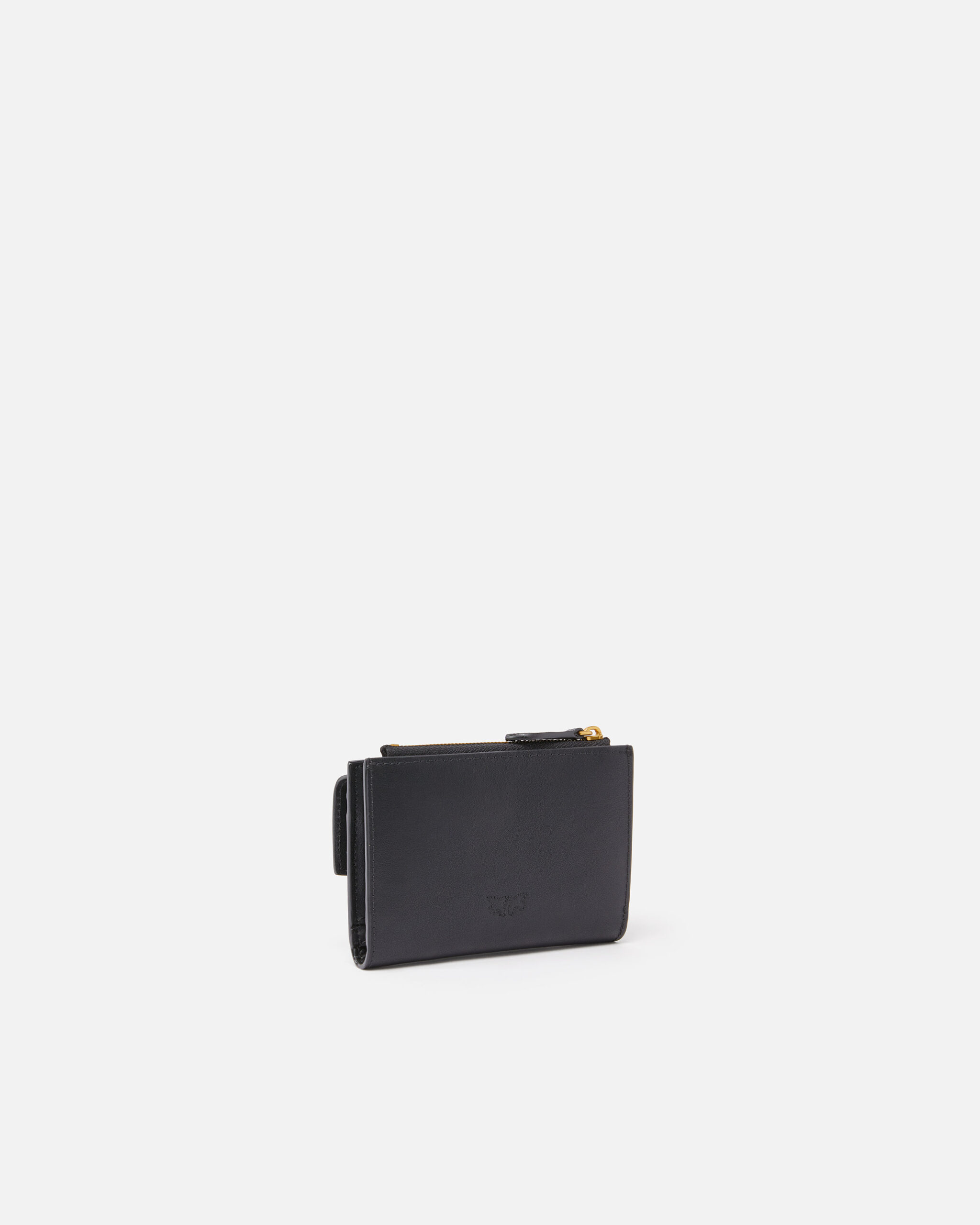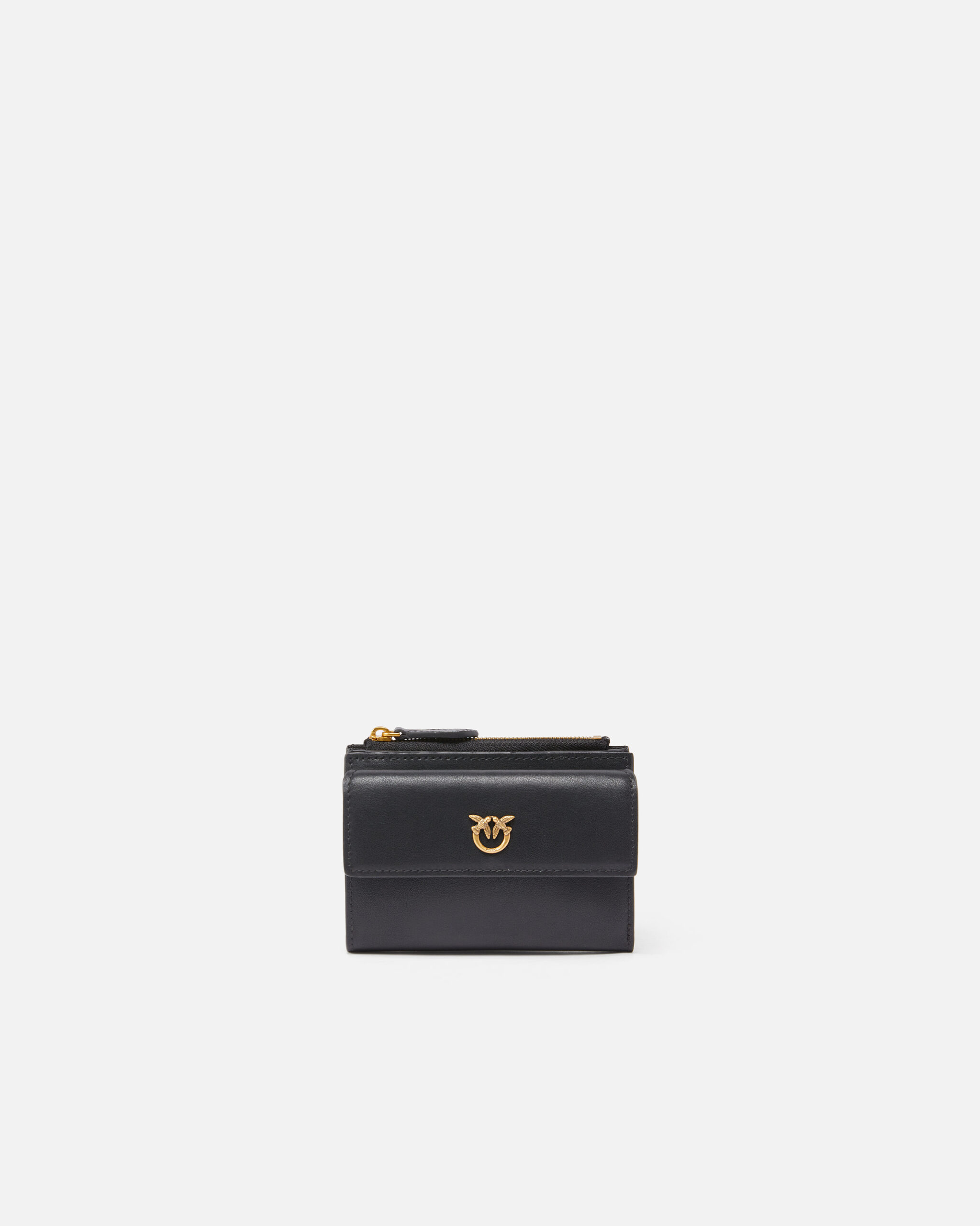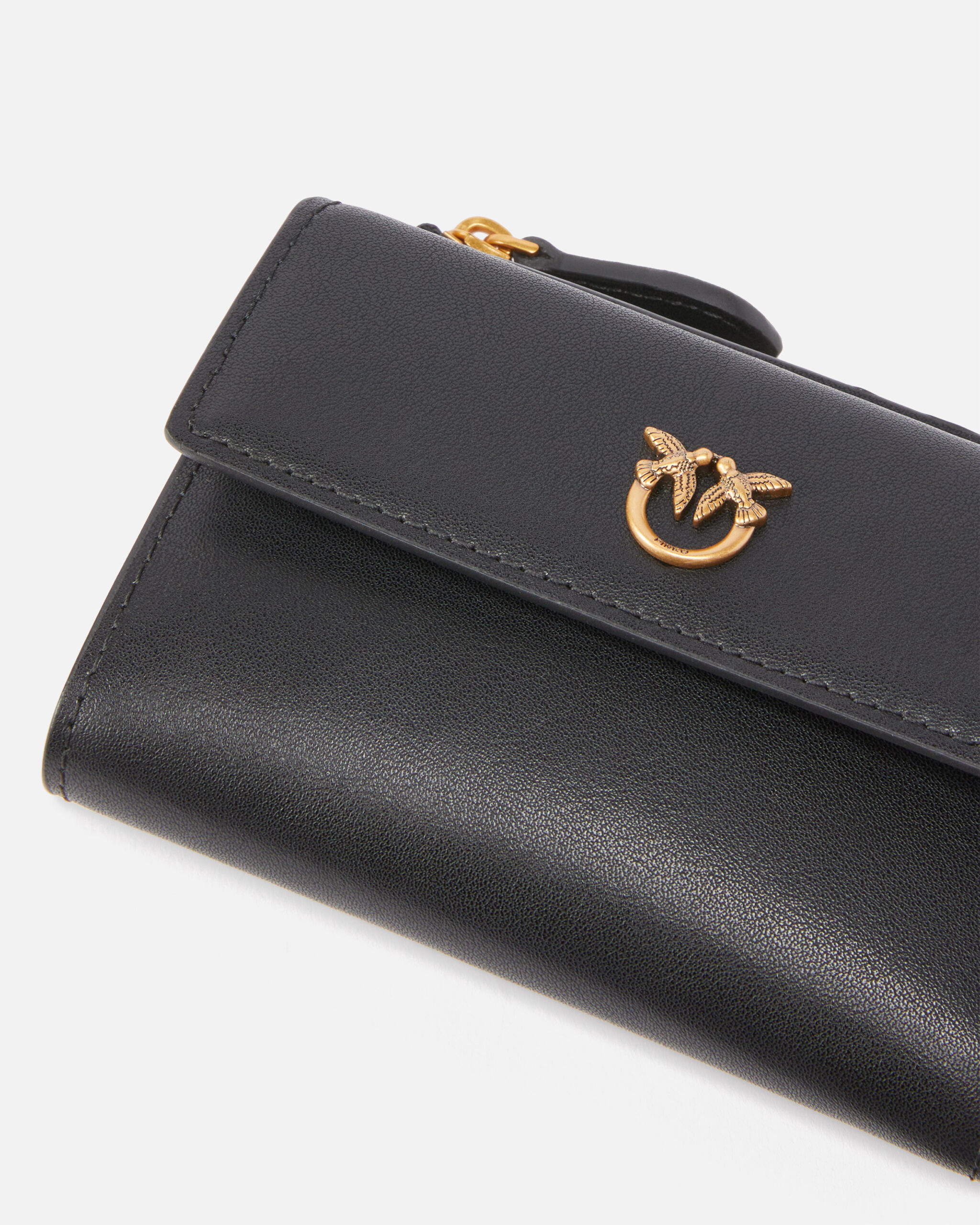 Cartera compacta y multifuncional de tamaño pequeño con forma rectangular realizada en piel suave al tacto con acabado liso. El interior de la cartera está bien organizado con varios compartimentos para tarjetas, mientras que el exterior se completa con un compartimento para monedas, cerrado con una solapa adornada con una pequeña placa de metal con el logotipo Love Birds Diamond Cut. La cartera se cierra con un botón interior para mantener su diseño compacto, perfecto incluso para los bolsos más pequeños.