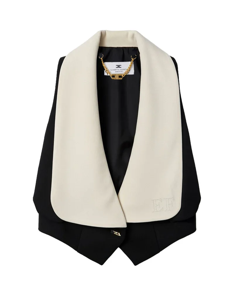 Chaleco de crepé ligero con solapas confeccionadas en raso, para un sofisticado contraste de texturas.