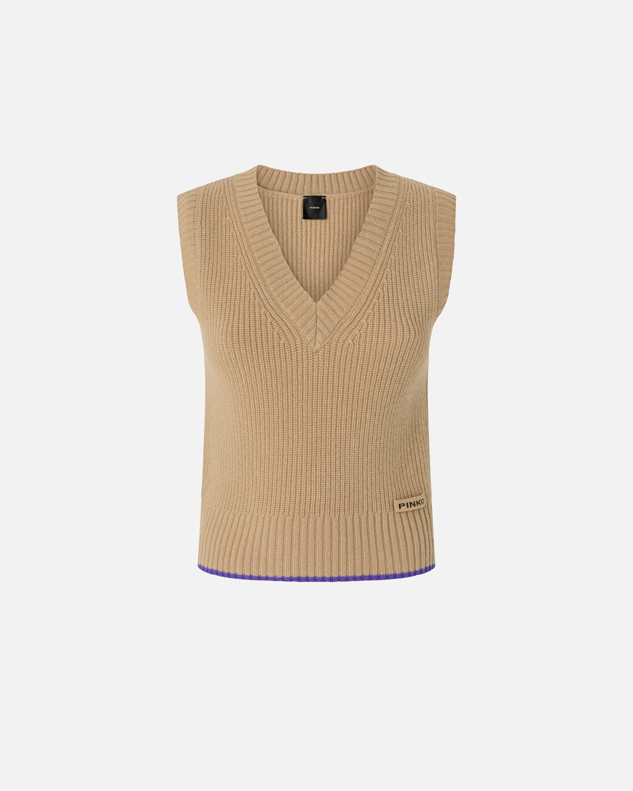 Chaleco de cuello en V en una fina mezcla de lana merino y cachemira, perfecto para la oficina y para cualquier ocasión. El hilo en contraste del bajo le da un toque delicado e inesperado de distinción. El bajo, las sisas y el cuello son acanalados, y el toque final lo da la etiqueta tono sobre tono con el logotipo de PINKO en el lateral delantero. La prenda ha sido sometida a pruebas de acabado para minimizar la formación de bolitas, garantizando así una mayor suavidad y durabilidad del tejido.