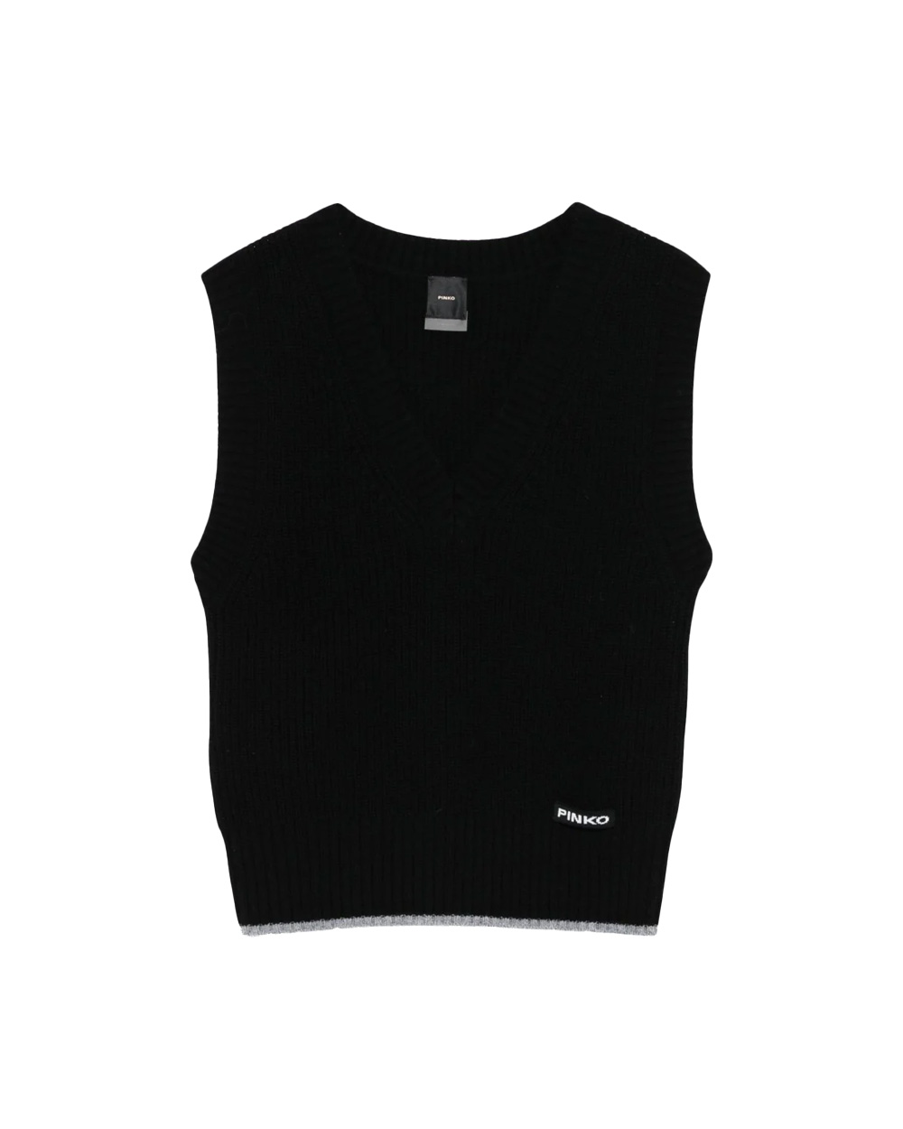 Chaleco de cuello en V en una fina mezcla de lana merino y cachemira, perfecto para la oficina y para cualquier ocasión. El hilo en contraste del bajo le da un toque delicado e inesperado de distinción. El bajo, las sisas y el cuello son acanalados, y el toque final lo da la etiqueta tono sobre tono con el logotipo de PINKO en el lateral delantero. La prenda ha sido sometida a pruebas de acabado para minimizar la formación de bolitas, garantizando así una mayor suavidad y durabilidad del tejido.