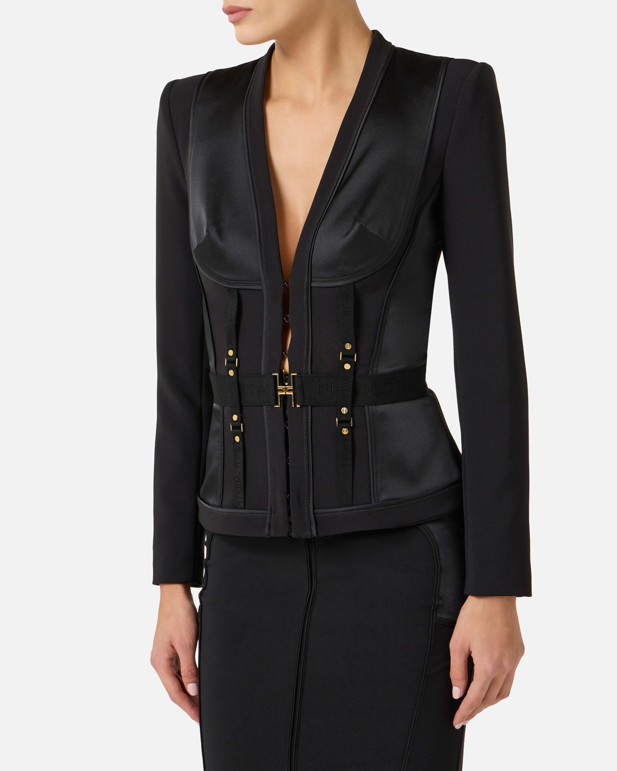 Chaqueta de crepé ligero. El blazer presenta hombros estructurados, cuello pico y mangas ¾. Se distingue por la confección tipo corsé, definida por las aplicaciones de raso, que crean sensuales juegos de cortes geométricos. El cinturón en la cintura está adornado con el logotipo de metal dorado. Talla adherente.