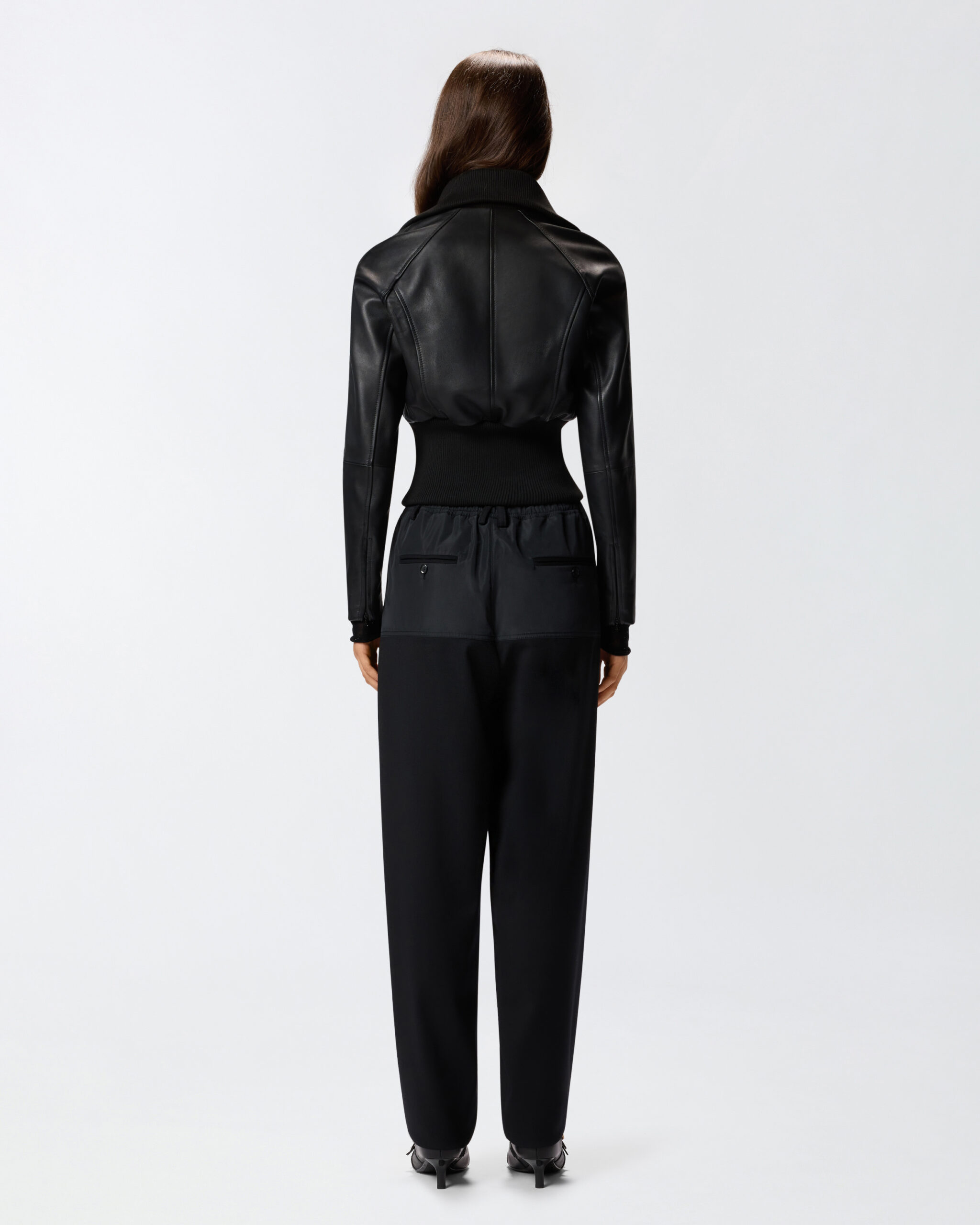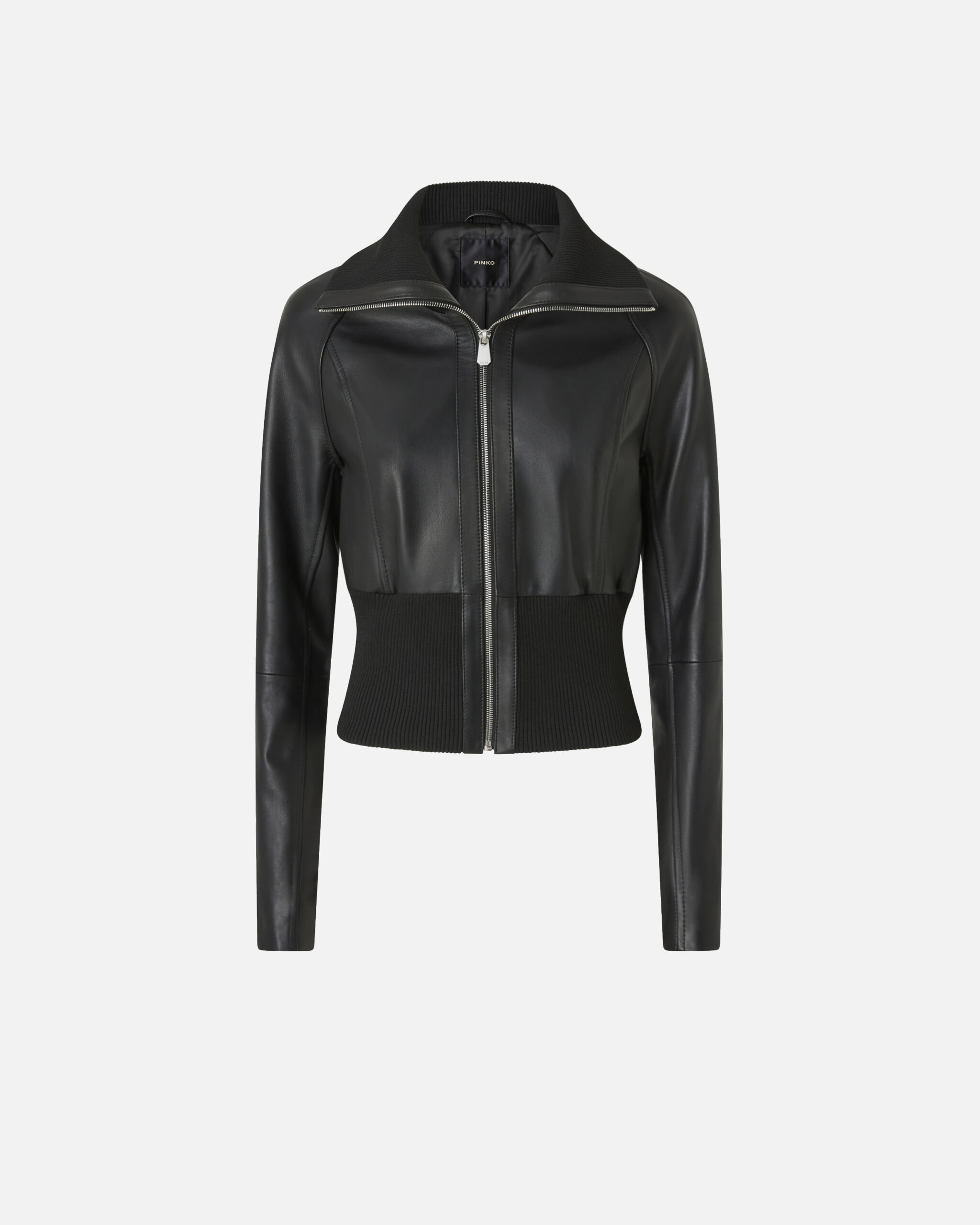 Chaqueta corta de línea ceñida y femenina, caracterizada por un cuerpo de suave napa combinado con un maxiborde inferior de punto acanalado. El cuello muy alto, perfecto para protegerte de los primeros fríos del cambio de estación, también está confeccionado en un cómodo punto acanalado. Cierre con cremallera de metal en la parte delantera. Esta cazadora motera es una prenda imprescindible en el armario, la prenda de abrigo ideal para afrontar el cambio de estación con determinación y un toque realmente atrevido.