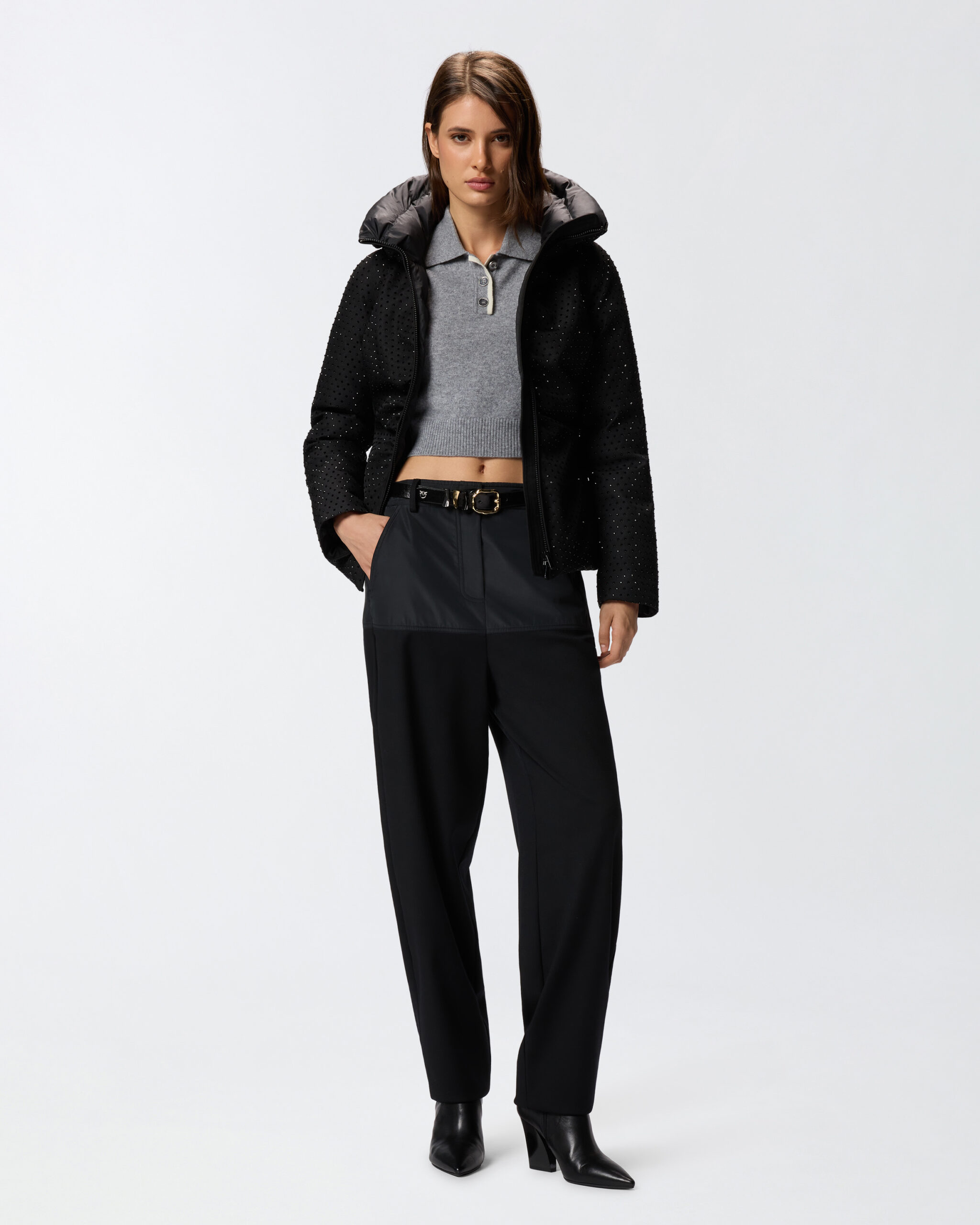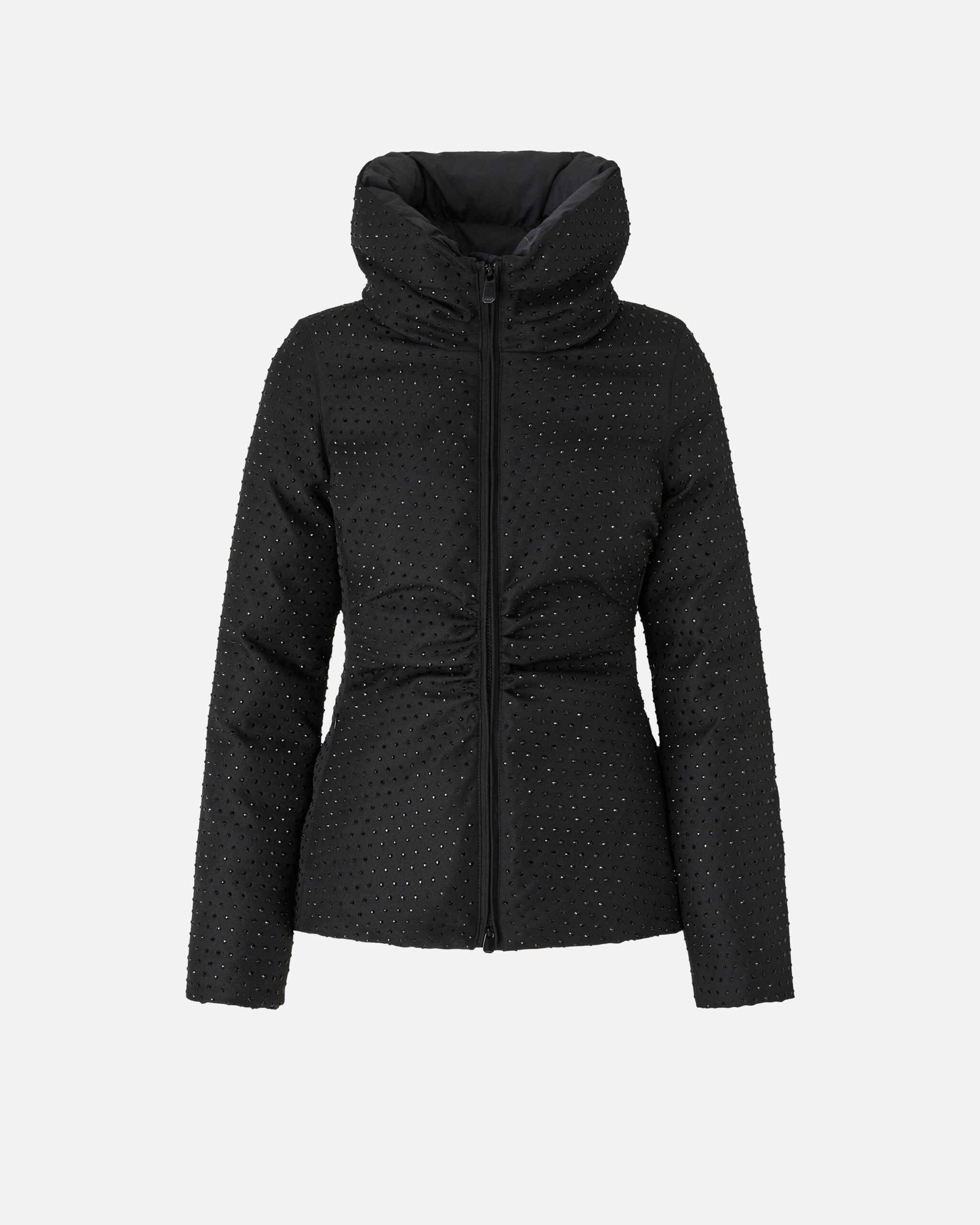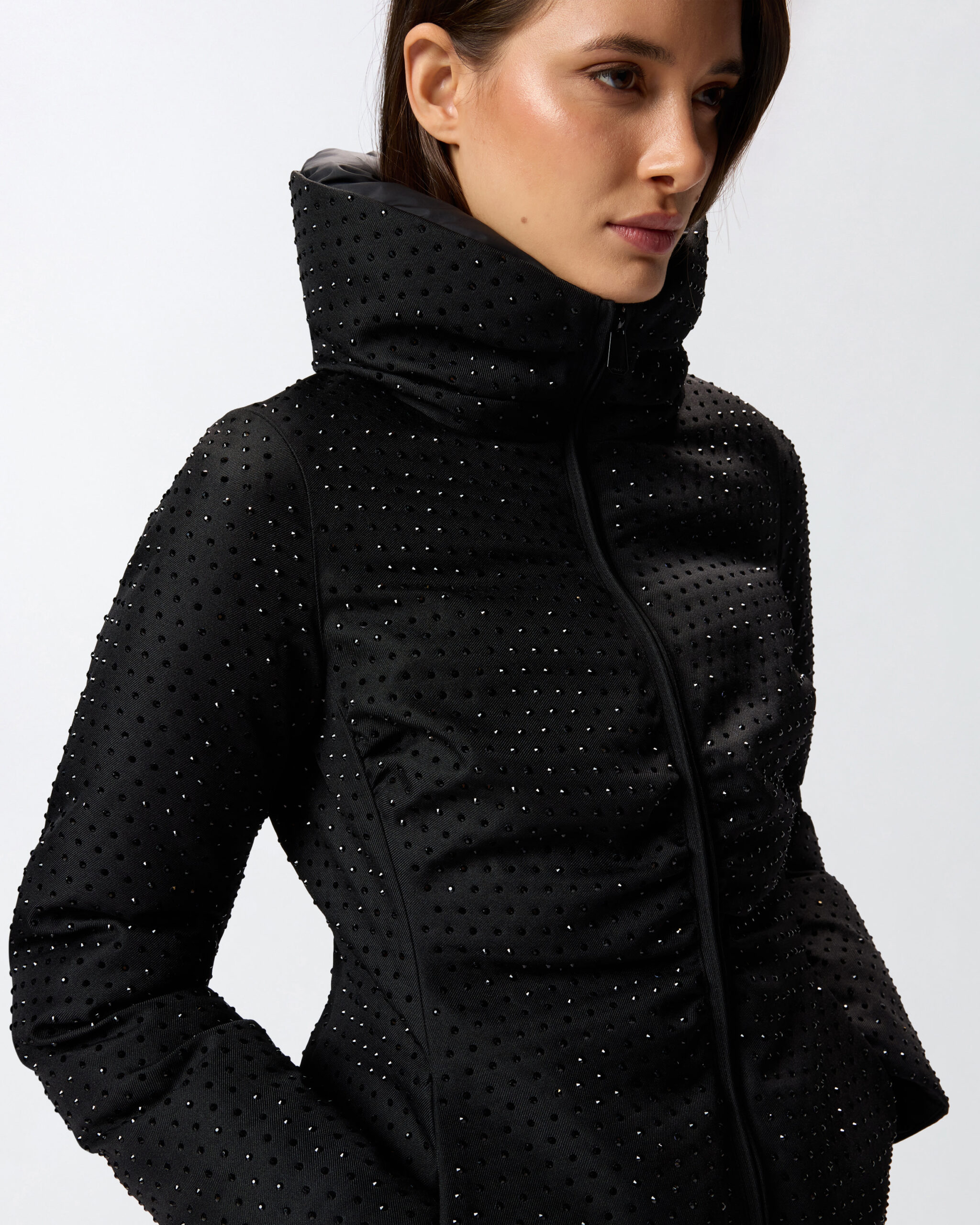 Plumífero corto de lona técnica decorado integralmente con mini pedrería tono sobre tono que le confieren un efecto brillante y contemporáneo. Modelo entallado, cuello alto y cierre de cremallera frontal. Forro interior de tejido técnico para mayor comodidad y funcionalidad. Ideal para combinar con looks total black y botas para un toque urbano, luminoso y sofisticado.