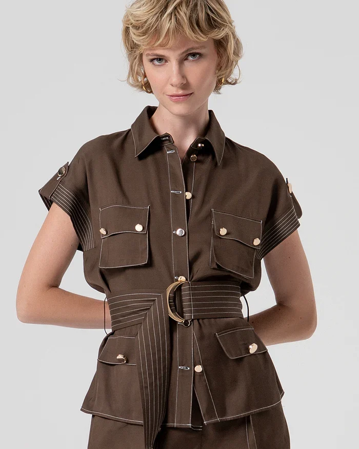 Chaqueta de corte regular confeccionada en viscosa. Cuello clásico, botones centrales para la apertura, bolsillos de parche, cinturón a juego en la cintura y mangas cortas con cierre de cordón.