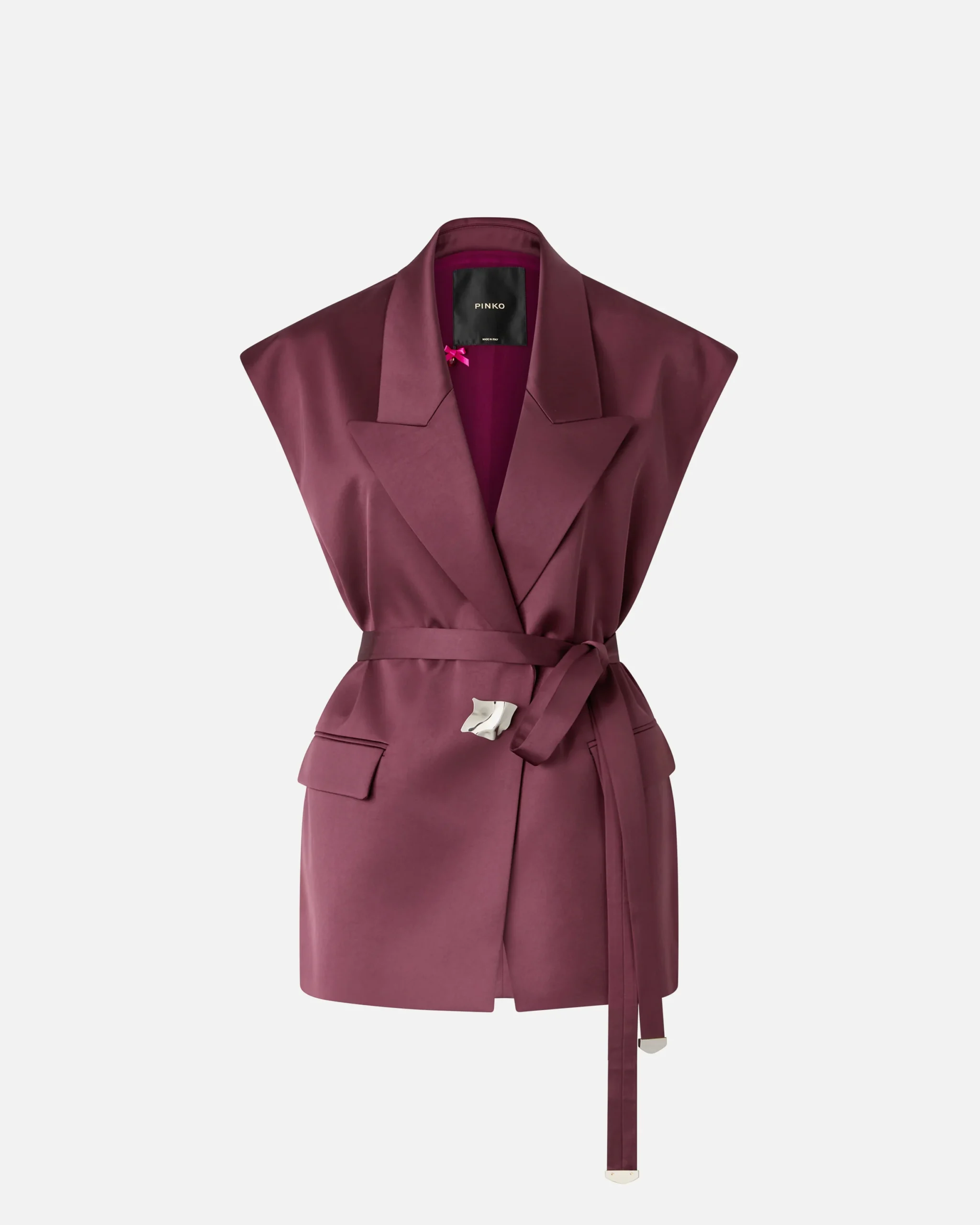 Chaqueta sin mangas con hombros caídos confeccionada en suave y brillante satén de doble cara, para brindar un aspecto refinado y uniforme tanto en el exterior como en el interior. La prenda, de corte holgado, cuenta con solapas de pico, dos bolsillos delanteros con solapa y un cierre de botonadura sencilla, con un botón a presión en el interior y un botón joya cuadrado y facetado en el exterior, que aporta brillo inmediato. Completa el diseño un cinturón a juego rematado con extremos metálicos que aluden al brillo del botón joya, para llevar anudado en la cintura o para quitarlo si así lo prefieres. El modelo está forrado para garantizar una mayor comodidad al llevarlo. Ponte esta chaqueta con la falda a juego para crear un total look femenino ideal para ocasiones formales.
