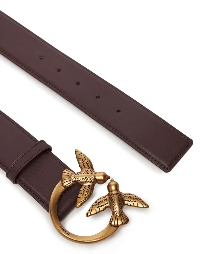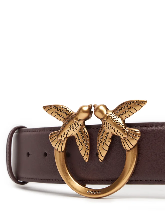Cinturón de piel lisa con acabado sedoso y hebilla Love Birds Diamond Cut de metal.