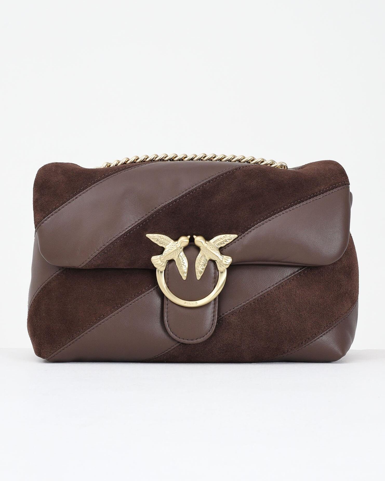 El bolso Classic Love Bag Puff está realizado en napa suave mezclado con ante con maxiacolchado oblicuo. El cierre se completa con la emblemática hebilla Love Birds Diamond Cut de metal. El interior presenta un forro de microfibra con efecto ante e incluye un panel divisorio con cierre de cremallera y un bolsillo interno. La correa combina la clásica cadena redonda de metal con una práctica hombrera de napa.