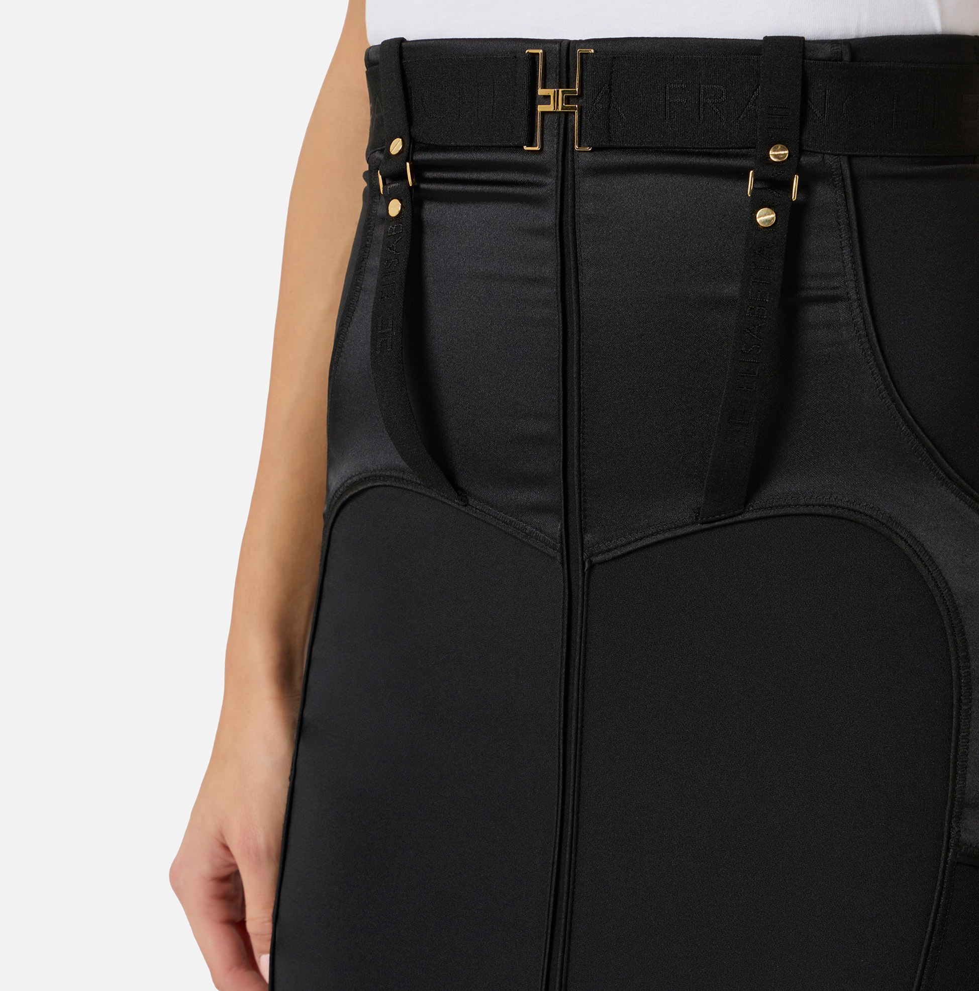 Falda a media pierna de crepé ligero. Se distingue por la confección tipo corsé, definida por las aplicaciones y por el cordoncillo de raso, que crean sensuales juegos de cortes geométricos. El cinturón en la cintura está adornado con el logotipo de metal dorado. Abertura en la parte trasera. Talla adherente.