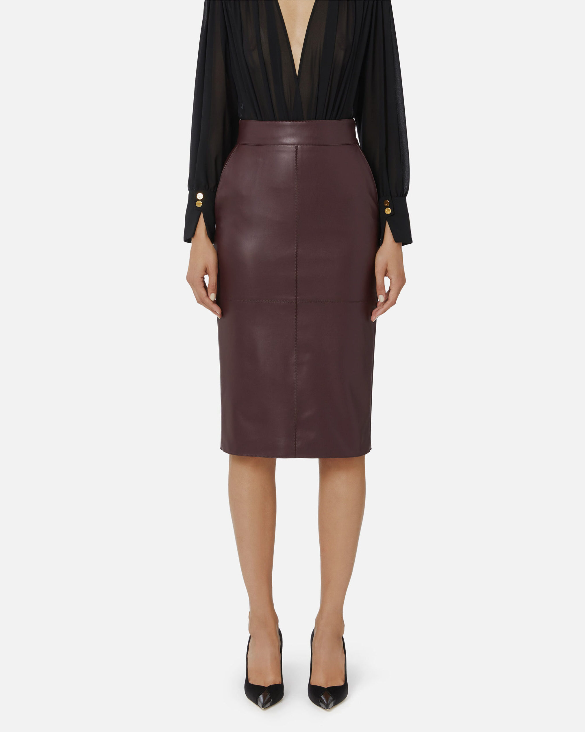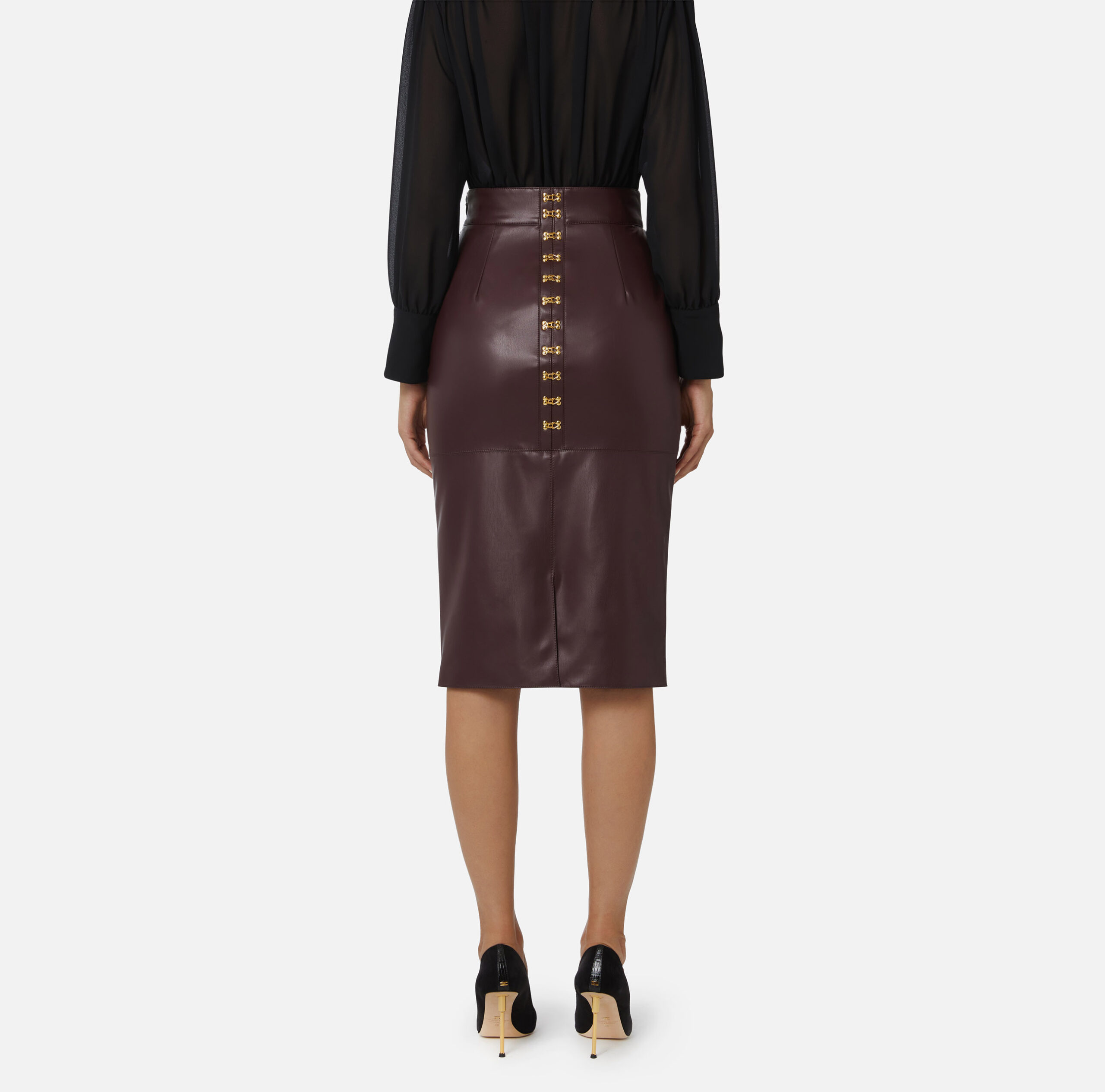 Falda de tubo hecha de material sintético efecto napa. Se caracteriza por los cortes con costuras que confieren estructura a la prenda. Sorprende la parte trasera con ganchos joya de metal dorado, que revelan su inspiración en el mundo de los corsés. Talla adherente.