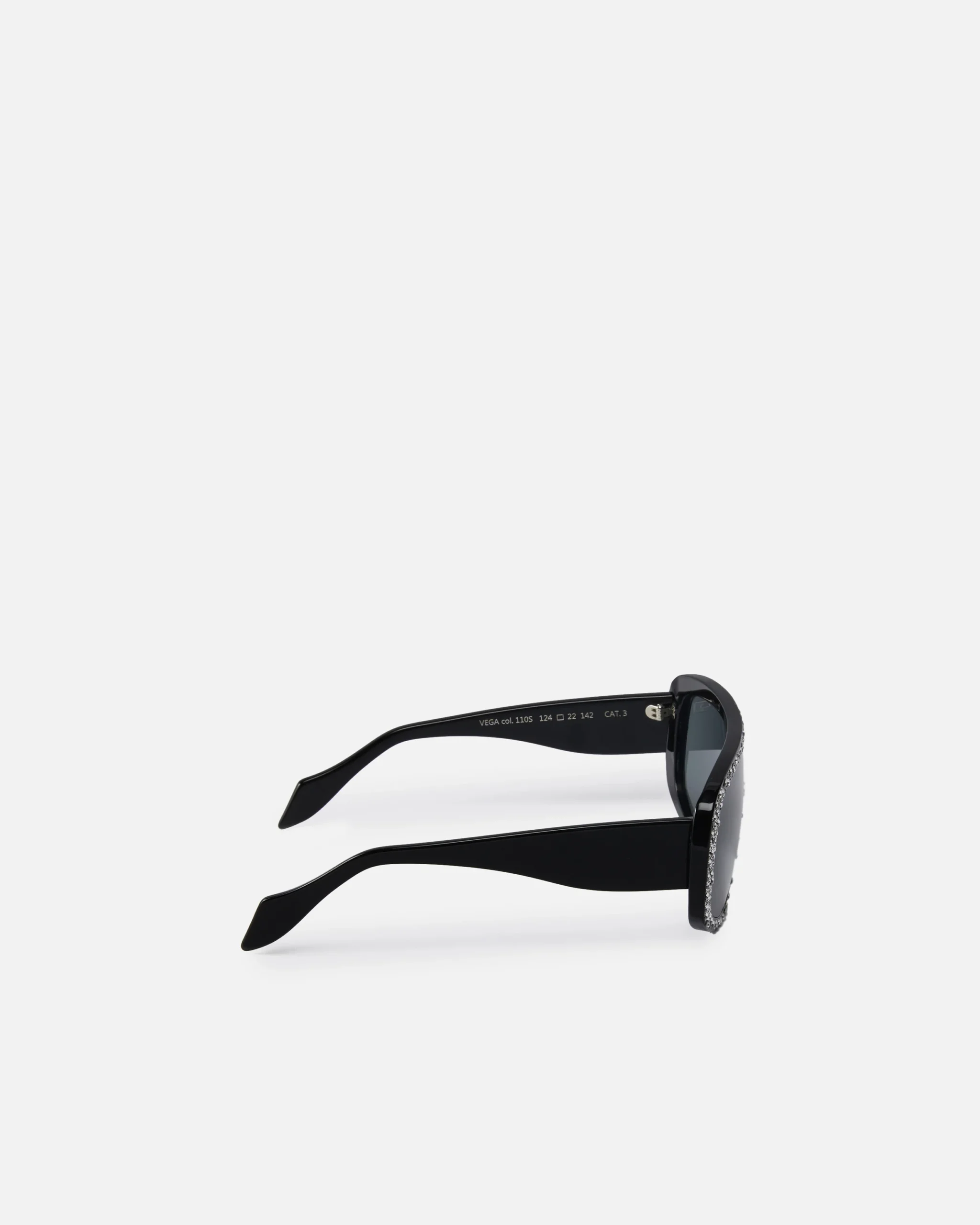Gafas de sol en forma de máscara con un diseño de inspiración retro reinterpretado en clave contemporánea y oversize, en acetato de celulosa, con lentes ligeramente espejadas. Estas gafas de sol llevan lentes de nailon, un material extremadamente flexible y resistente, y con una calidad óptica superior, de categoría 3, que garantizan una excelente protección de la luz solar y los rayos UV. Este modelo se realza con una aplicación de Swarovski brillantes, realizada por una empresa italiana especializada en estos procesos especiales. La varilla izquierda está adornada con el icónico logotipo de PINKO para completar el estilo de inspiración urbana que define este modelo. La producción de la colección cápsula se realiza íntegramente en Italia, desde el estudio del modelo hasta el diseño y la producción de las gafas acabadas. Incluso las piezas pequeñas, como las charnelas del frente, los núcleos de las varillas y los tornillos, provienen de empresas italianas.