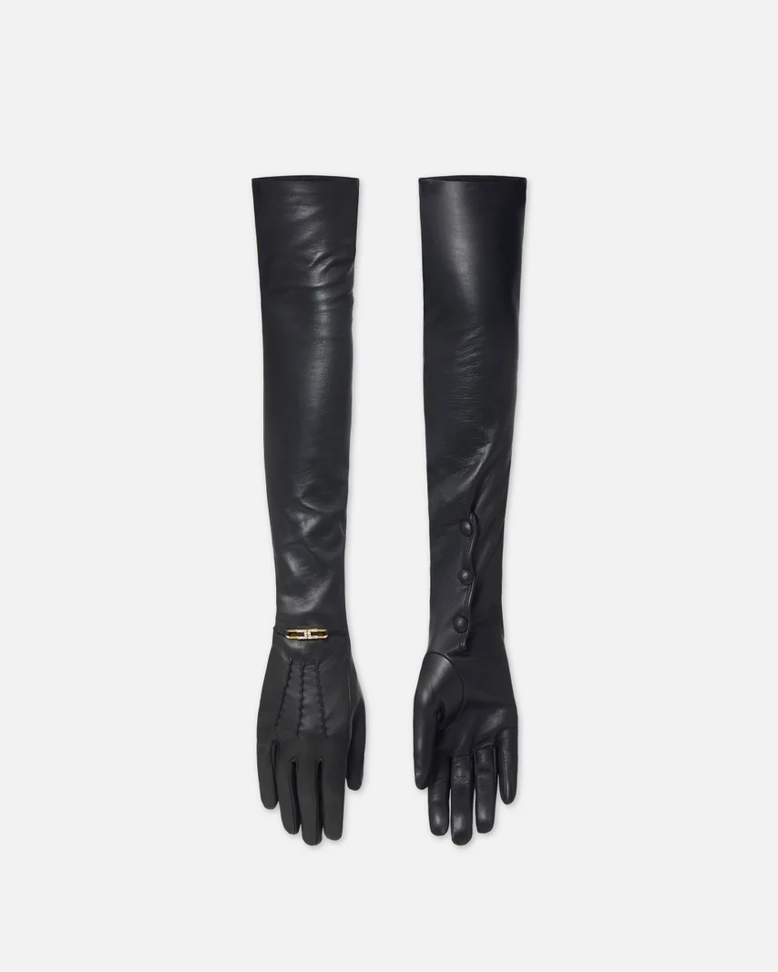 Guantes largos de ante de diseño ceñido y femenino. Con forro interno de punto, son adornados con el detalle joya con logotipo y estrás. Las nervaduras a tono definen la forma, se cierran con botones automáticos.
