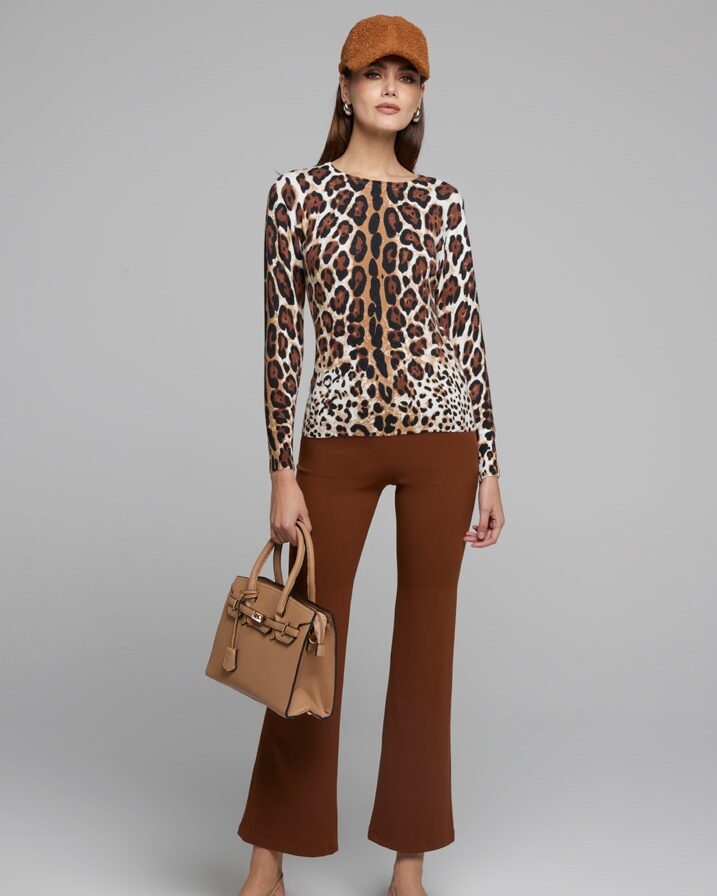Jersey de manga larga con cuello redondo y vibrante estampado leopardo en tonos marrón, beige y negro, ideal para un look audaz y moderno. Fabricado con material ligero y cómodo, este jersey de mujer combina perfectamente con pantalones de corte ancho y accesorios elegantes. Perfecto para la temporada otoño-invierno 2025, destaca por su estilo animal print. Descubre ahora jerseys estampados, moda animal print y tendencias fashion 2025.