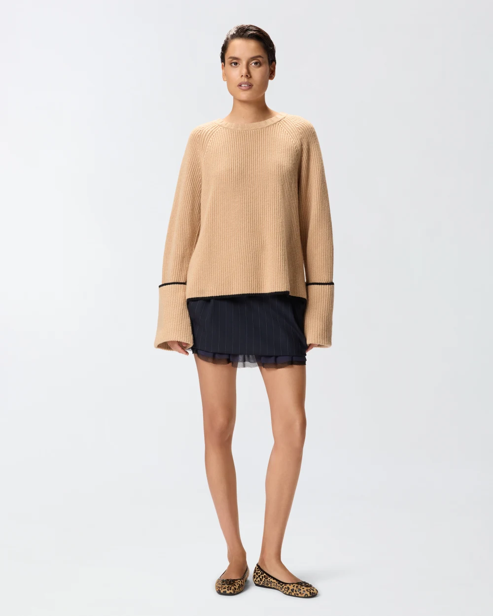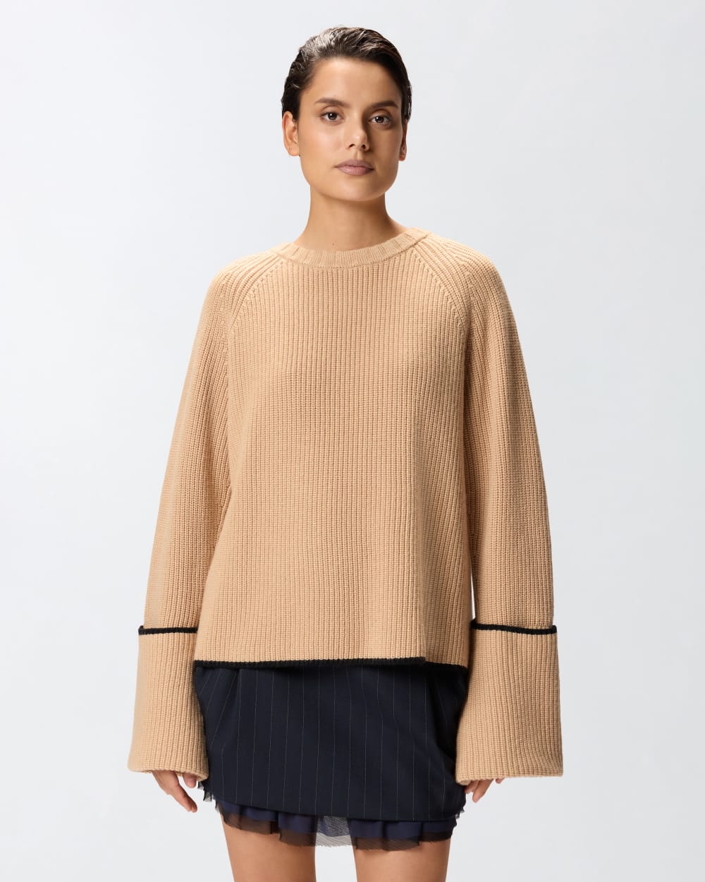 Jersey de cuello redondo y mangas extralargas en suave mezcla de lana merina y cachemira. El hilado en contraste en el bajo y en el amplio dobladillo de los puños es un delicado toque de clase. Todo ello se completa con la etiqueta tono sobre tono con logotipo de letras PINKO detrás del cuello. La prenda se ha sometido a pruebas de acabado para minimizar la posible formación de bolitas, garantizando una mayor suavidad y durabilidad del tejido. Este jersey de diseño sencillo se convertirá en un auténtico básico para tus conjuntos de invierno.