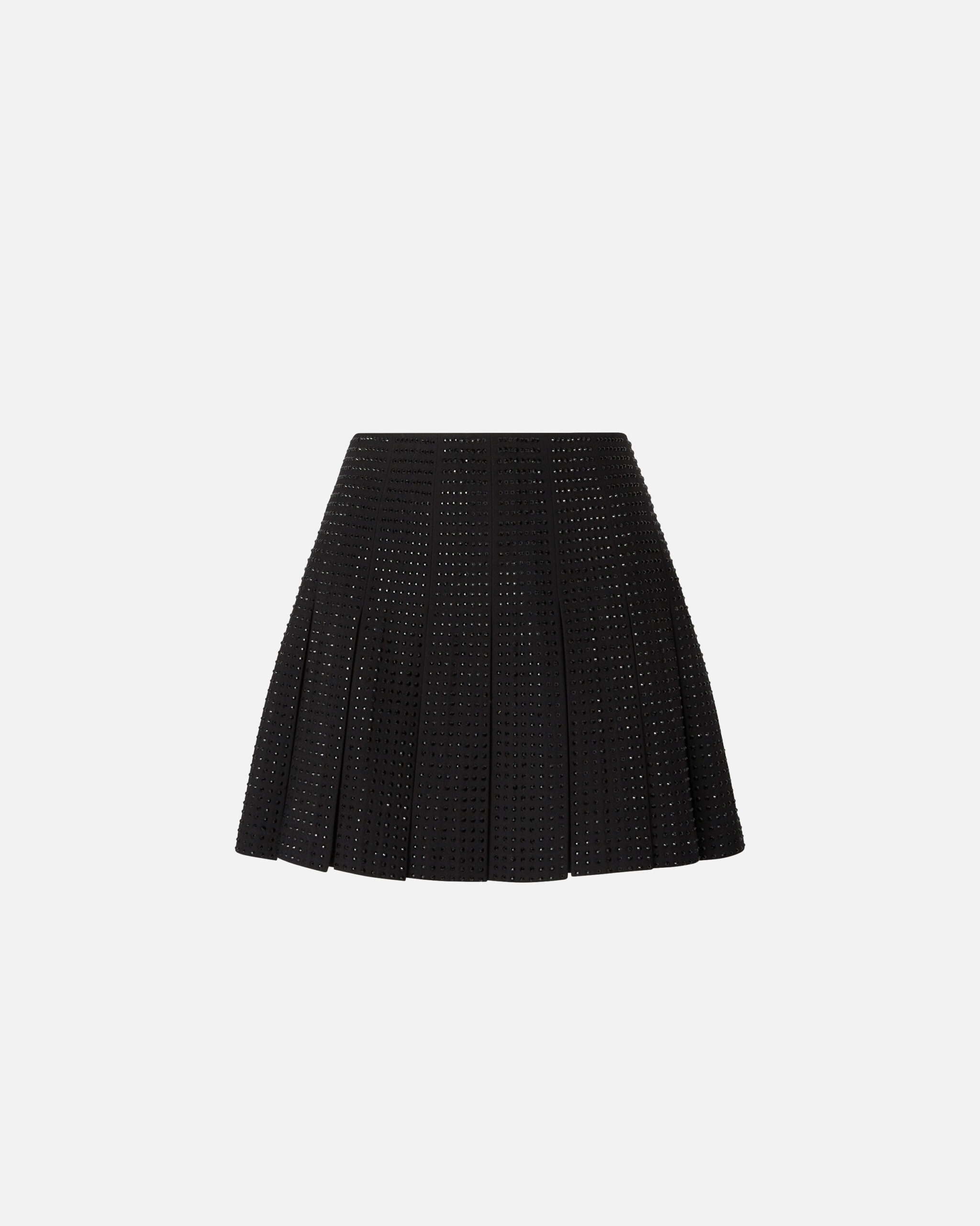 Minifalda de línea acampanada marcada por pliegues bien definidos que dan movimiento al look. Los innumerables strass a tono, los verdaderos protagonistas del look, revisten todo el diseño y completan la prenda con un toque brillante. Este modelo original iluminará tus veladas y tus estilismos.