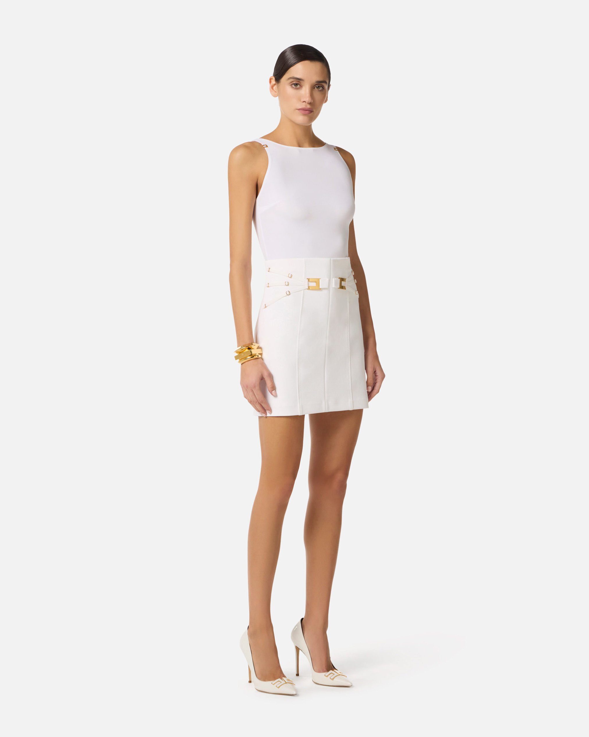 Falda corta de tiro alto de doble crepé elástico. Los laterales están definidos por elásticos inspirados en el mundo de la lencería que dibujan un motivo geométrico. Las placas con logotipo de metal dorado añaden luminosidad. Talla adherente.