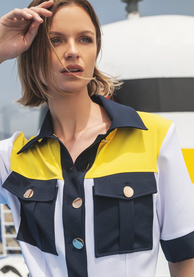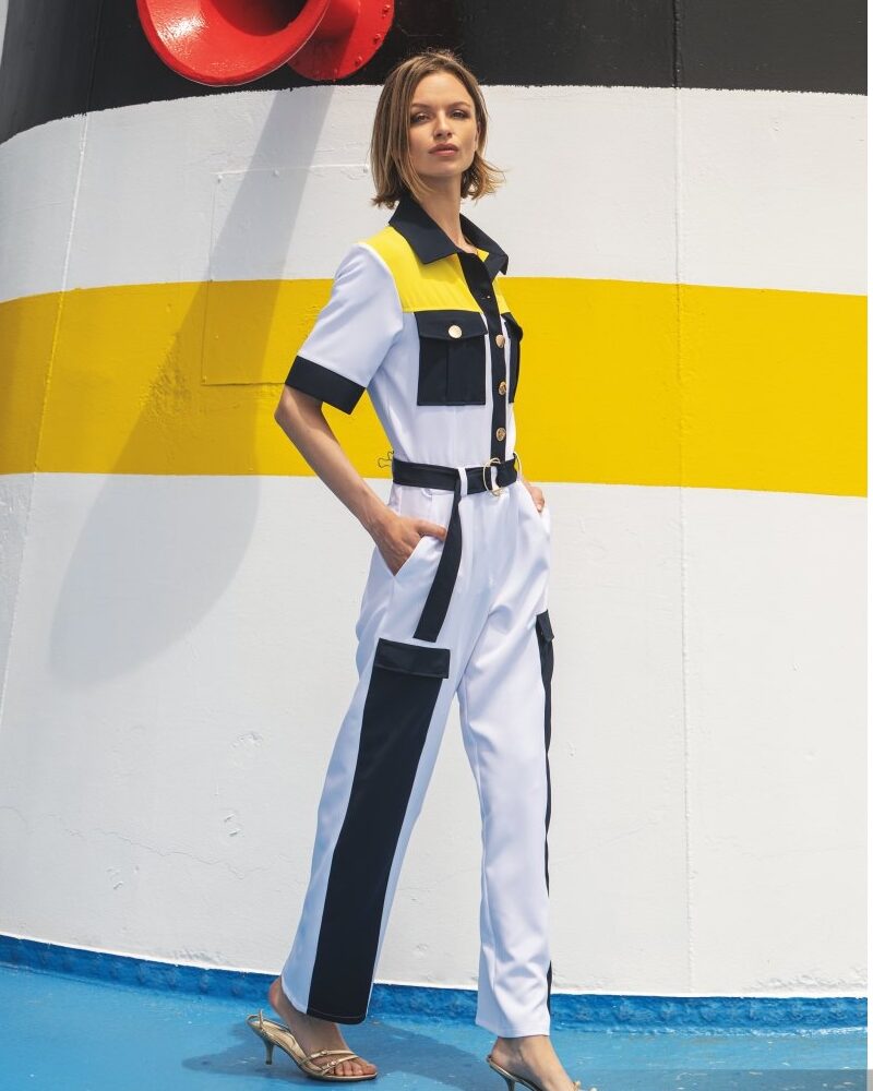 ¡El jumpsuit que grita “verano inolvidable” y tendencia total! Color block audaz en blanco impecable con paneles azules verticales y acentos amarillos vibrantes – inspirado en el mar, los barcos y el estilo sailor reinventado para 2026.