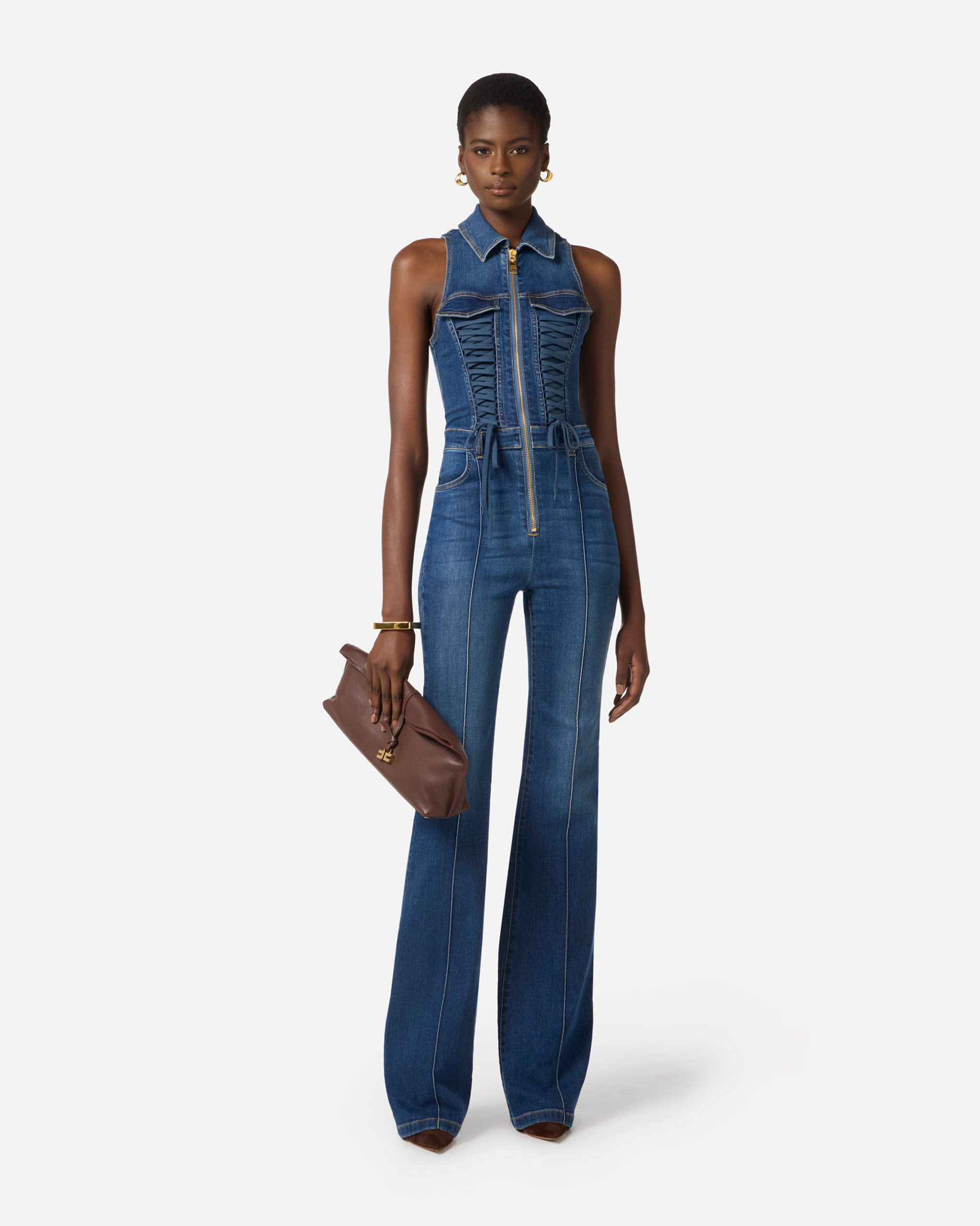 Mono de denim sin mangas y con cuello camisero. Confeccionado con tiro alto y línea acampanada. Se inspira en el mundo de la corsetería, los cordones cruzados decoran la parte delantera dibujando una línea de corte corsé. La cremallera de metal dorado añade un toque de luz. Bolsillos traseros, uno de ellos personalizado con cinta diagonal con logotipo. Talla adherente.