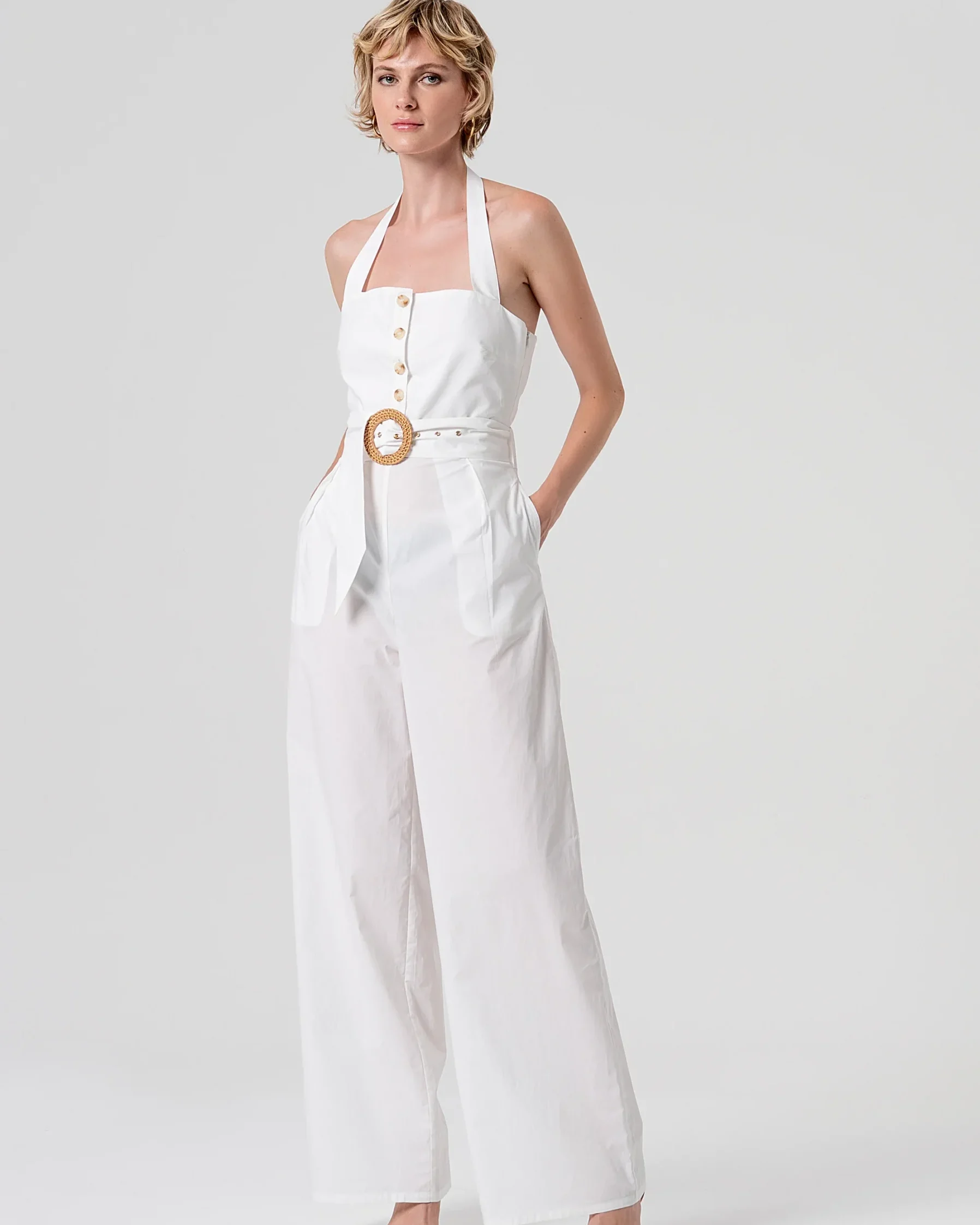 Mono largo sin mangas de algodón. Escote cuadrado, tirantes atados al cuello, cinturón en la cintura y pantalón de pierna ancha con bolsillos laterales.
