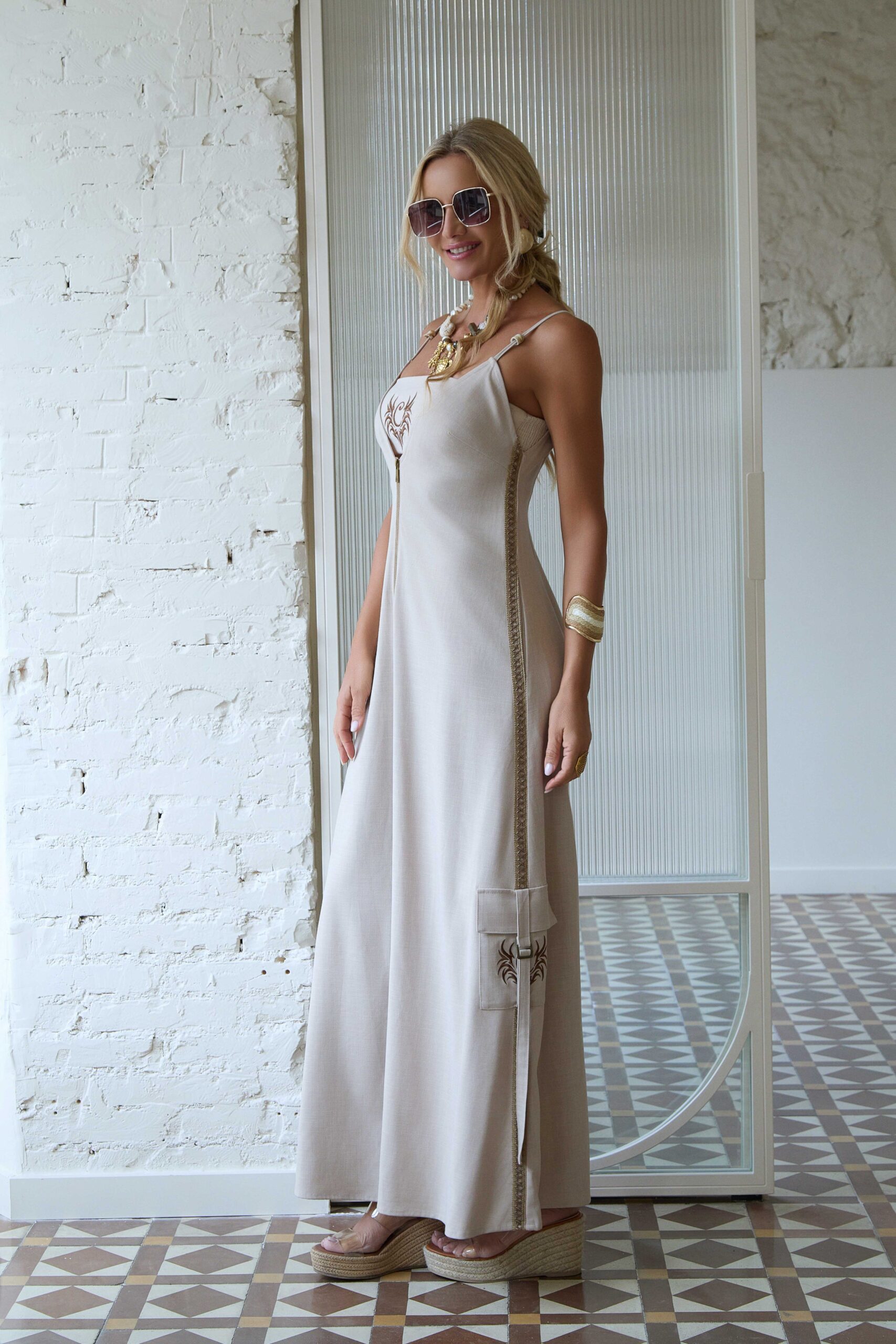 ¡El mono palazzo que combina elegancia máxima con comodidad total! En blanco impecable y puro, con tirantes finos, escote cuadrado con cremallera dorada central como detalle statement, piernas ultra anchas palazzo con caída fluida y bolsillos cargo laterales con bordado dorado a juego. El pecho luce un bordado dorado sofisticado que le da un toque luxury único.