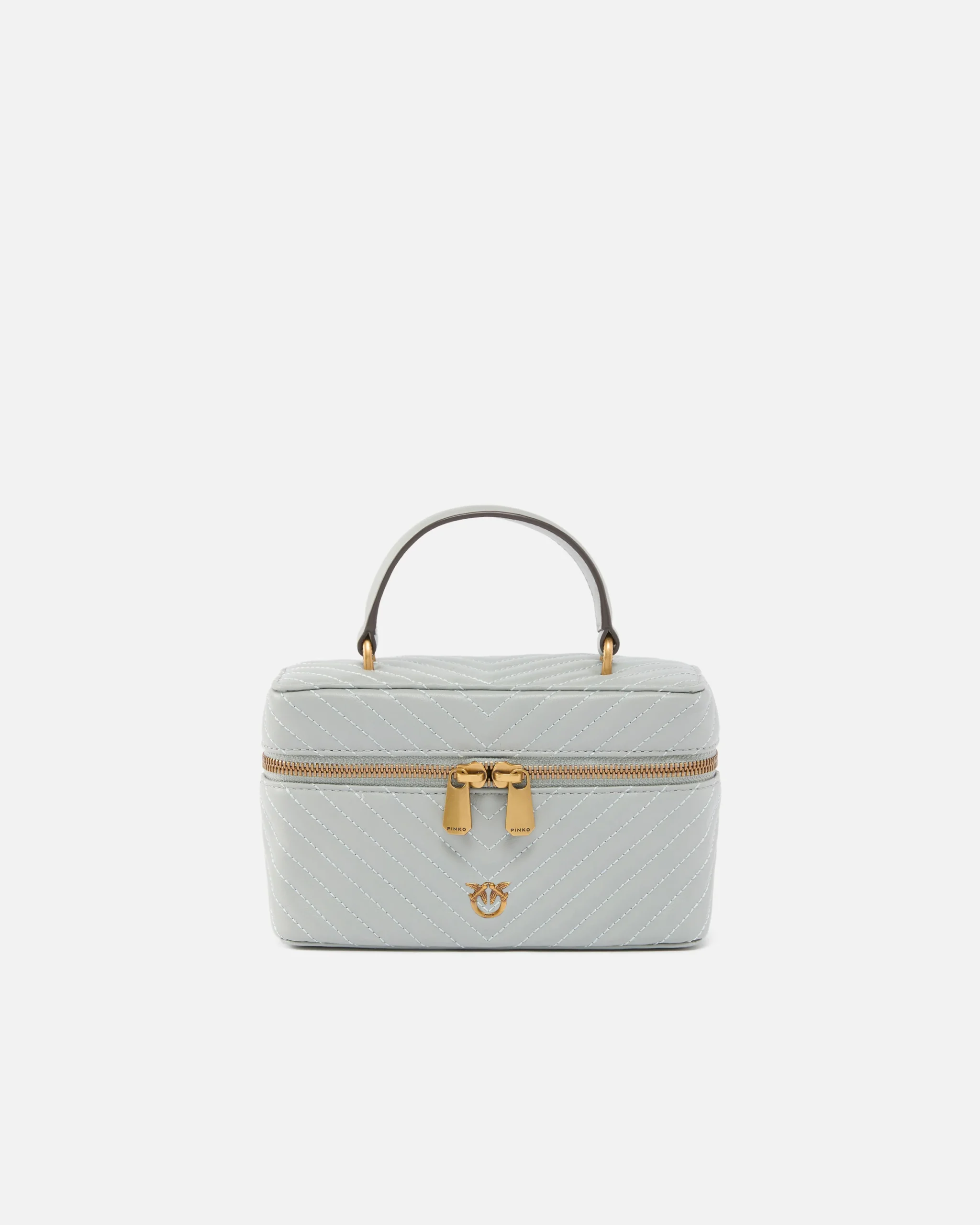 Pequeño neceser con diseño compacto en suave napa acolchada con motivo de chevrón diseñado con una bandolera a juego extraíble y un asa superior que permiten llevarlo de tres formas, como un auténtico bolso: al hombro, cruzado y en la mano. El modelo, adornado con la inconfundible placa metálica con el logotipo Love Birds Diamond Cut en la parte delantera, cuenta con un cierre perimetral con cremallera de doble cursor que revela un interior espacioso forrado en dril de algodón. Este neceser es el compañero de viaje ideal, práctico y, al mismo tiempo, glamuroso, para llevar siempre contigo tus básicos de belleza. ¡Activa tu accesorio PINKO: verifica la autenticidad de tu producto y accede a la experiencia personalizada acercando tu smartphone al bordado Love Birds que encontrarás en la parte posterior!