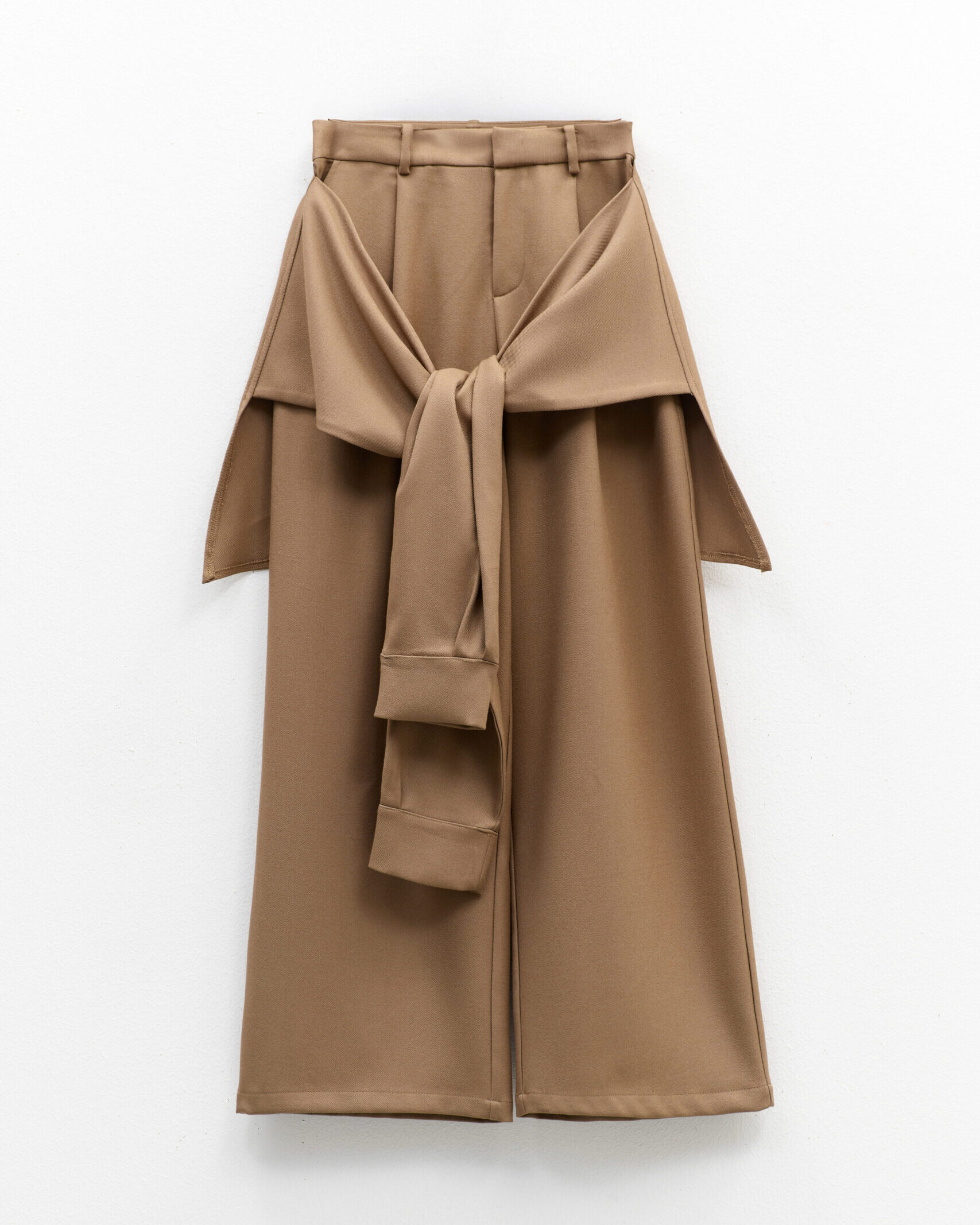Este pantalón beige de corte ancho destaca por su diseño innovador con un nudo frontal que añade un toque único y elegante. Fabricado en un tejido suave y fluido, ofrece comodidad y estilo, ideal para looks casuales o semiformales. Perfecto para combinar con blusas o camisas, aporta versatilidad a cualquier guardarropa.
