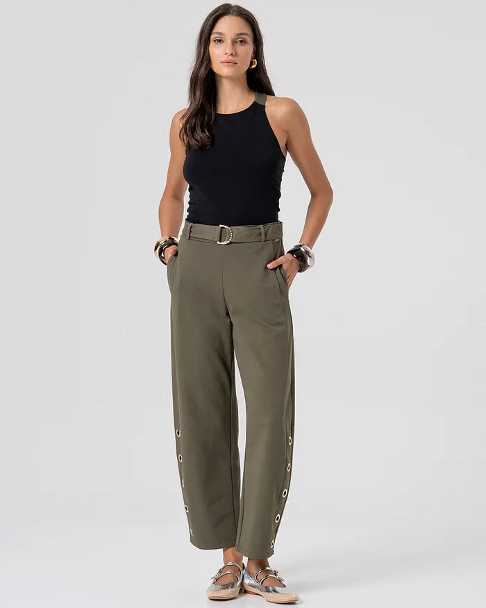 Pantalón zanahoria de corte globo, confeccionado en forro polar con ojales. Cintura estándar con fajín y bolsillos laterales.